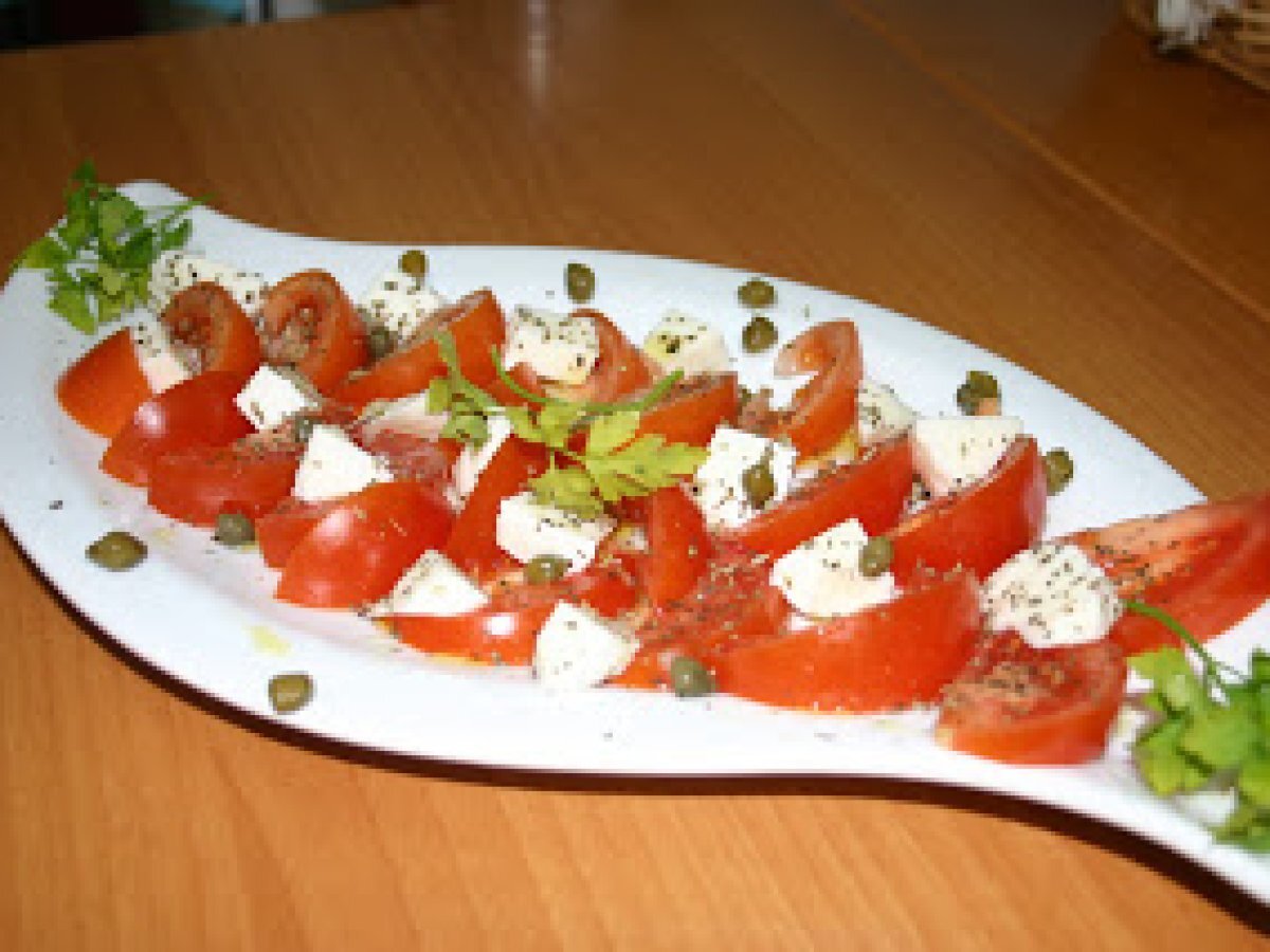 Ensalada de tomate y mozzarela con alcaparras, albahaca y orégano