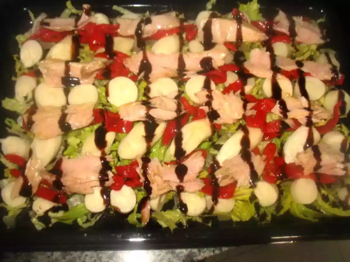 Ensalada de ventresca de bonito EntranteMedio30 min127 Kcal Enviar esta receta a un amigo Imprimir esta página Preguntar al autor Publicar la foto de esta receta Ingredientes 4 1 lata de Ventresca de Bonito de Conservas Serrats 1 lechuga 1 bote de Palmito 1 bote de Pimientos del piquillo Vinagre de Módena Sal Aceite de oliva virgen
