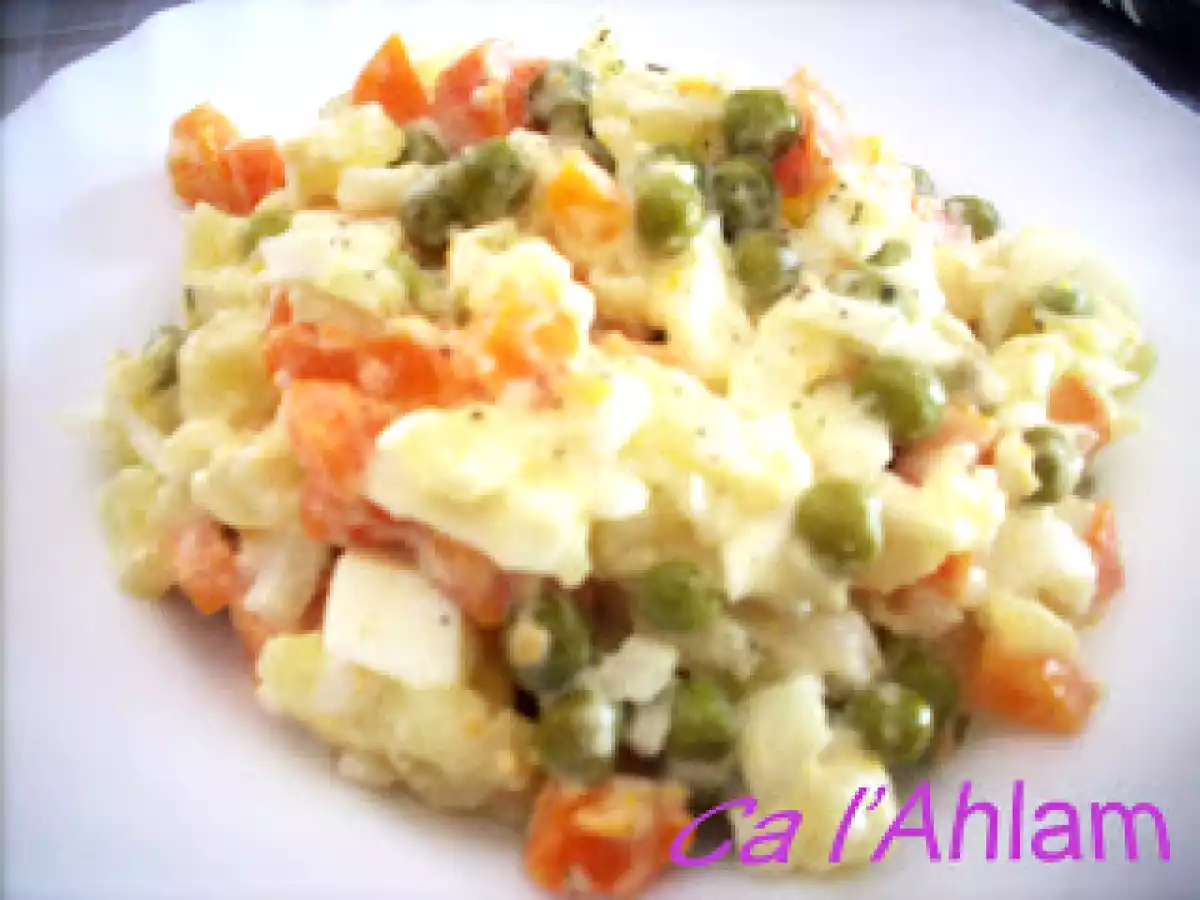 Ensalada de verduras EntranteMedio50 min682 Kcal Enviar esta receta a un amigo Imprimir esta página Preguntar al autor Publicar la foto de esta receta Ingredientes 2 5 patatas 5 zanahorias 1 puñado de guisantes 1 puñado de judias verdes 1 cebolleta 2 huevos duros 1 lata de atún Mayonesa: con 1 huevo + sal + aceite 1 dedito de leche sal y pimienta negra Costo estimado: 4.4Euros€ (2.2€/porción)