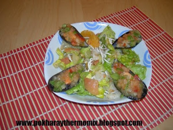 Ensalada del mar y mejillones a la vinagreta (sin thermomix) EntranteFácil30 min Enviar esta receta a un amigo Imprimir esta página Preguntar al autor Publicar la foto de esta receta Ingredientes 2 Ensalada del mar: Lechuga Bacalao ahumado Una naranja Un tomate Un paquete de gulas del norte Un poco de cebolla o cebolleta Aceite Sal Vinagre Mejillones a la vinagreta: 1 bolsa de mejillones al vapor 1 pimiento verde 1 pimiento rojo 1 tomate 1 cebolla pequeña Aceite Vinagre Sal