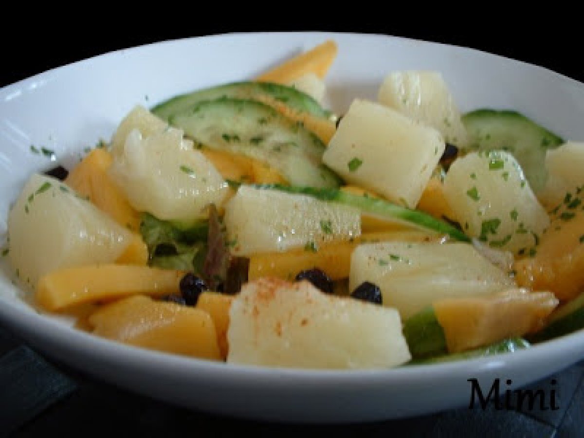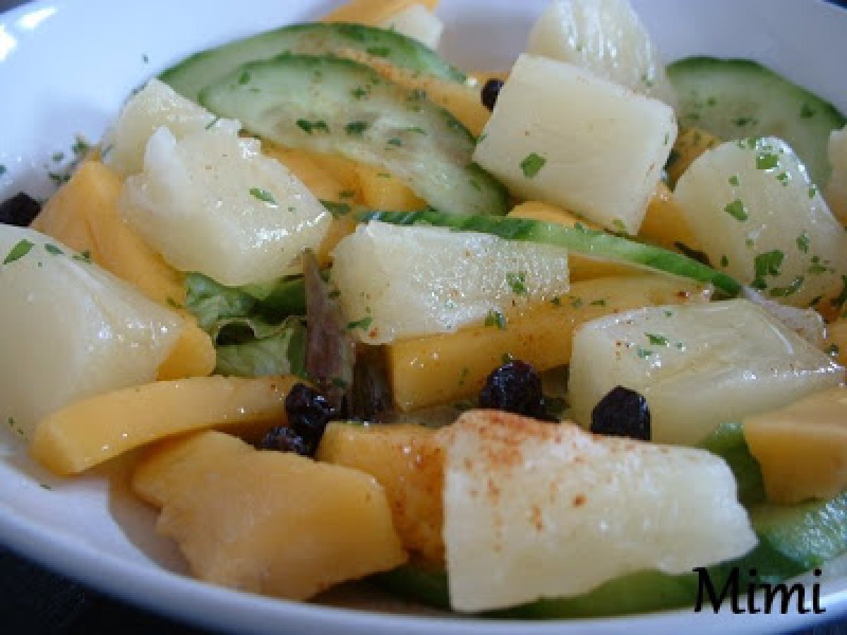 Ensalada exótica de piña, mangao y pepino vota ahora AnteriorSiguiente EntranteFácil20 min3652 Kcal Enviar esta receta a un amigo Imprimir esta página Preguntar al autor Publicar la foto de esta receta Ingredientes 1 1 bolsita de ensalada mixta 4 rodaja de piña 1 mango 1 pepino 4 cebolletas 2 cucharadas de uvas pasas 2 cucharadas de cilantro picado Para el aderezo: 1 cucharadita de salsa de chile 2 cucharadas de zumo de limón 2 cucharadas de aceite de sesamo o de girasol 2 cucharadas de miel Costo estimado: 16.07Euros€ (16.07€/porción)