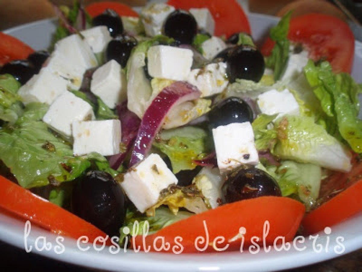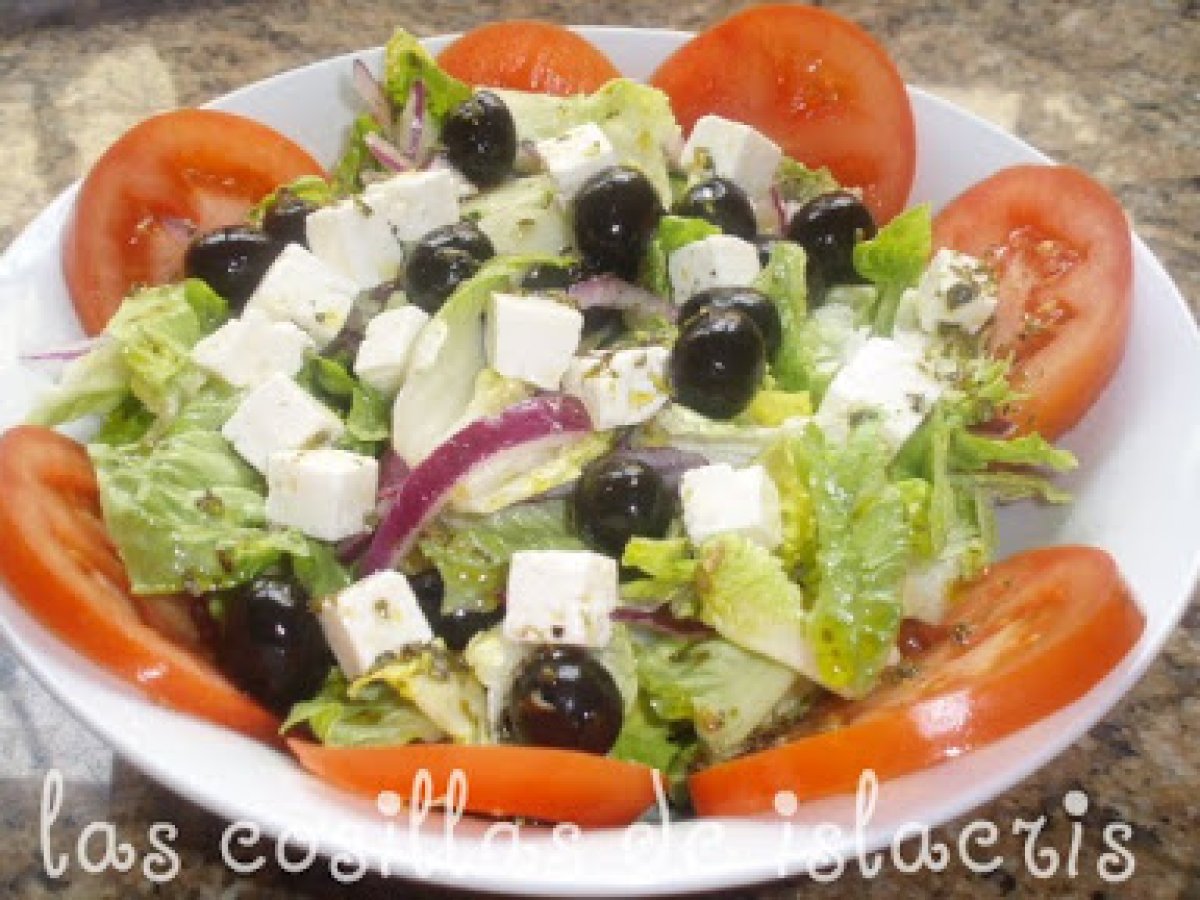 Ensalada griega AnteriorSiguiente EntranteFácil35 min418 Kcal Enviar esta receta a un amigo Imprimir esta página Preguntar al autor Publicar la foto de esta receta Ingredientes 4 2 cogollos de lechugas 1 tomate 100 g de queso feta 4 corazones de alcachofas cocidos 1/2 pepino 1/2 cebolla roja Aceitunas negras 8 cucharadas de aceite 2 de zumo de limón o vinagre Sal y Pimienta 1/2 cucharadita de orégano