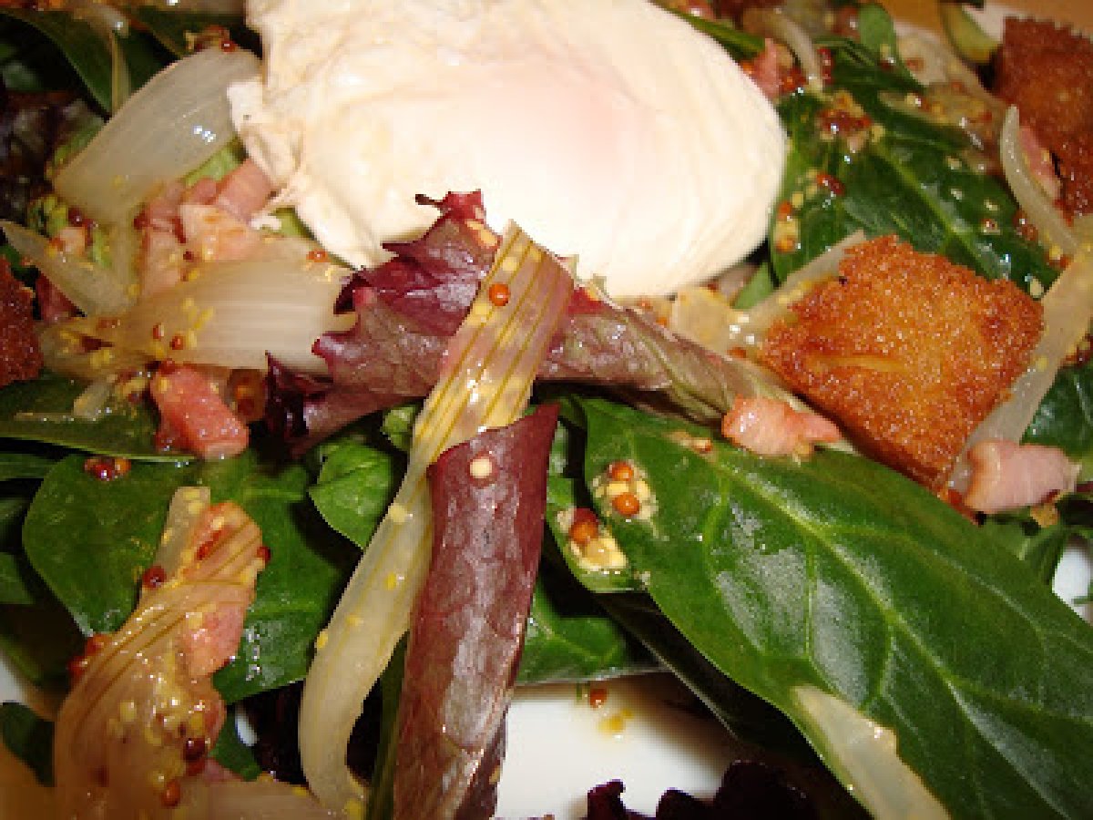 Ensalada lionesa EntranteFácil45 min359 Kcal Enviar esta receta a un amigo Imprimir esta página Preguntar al autor Publicar la foto de esta receta Ingredientes 4 2 dientes de ajo Aceite para freir Aceite de oliva Sal 4 rebanadas de pan blanco sin corteza 2 cebolletas tiernas cortadas 3 lonchas de beicon 80 ml de vinagre de vino tinto 3 cucharaditas de mostaza de grano 225 g de brotes verdes o escarola 4 huevos Costo estimado: 3.94Euros€ (0.98€/porción)