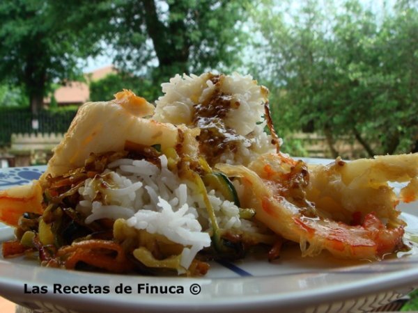 Ensalada templada de arroz basmati, verduras en wok y langostinos EntranteFácil50 min Enviar esta receta a un amigo Imprimir esta página Preguntar al autor Publicar la foto de esta receta Ingredientes 2 1) 1 calabacín 1 puerro 1 zanahoria 6 langostinos cocidos o 4 si son muy grandes sal aceite de oliva virgen extra 2) 100 g de arroz por persona un poco de sal agua