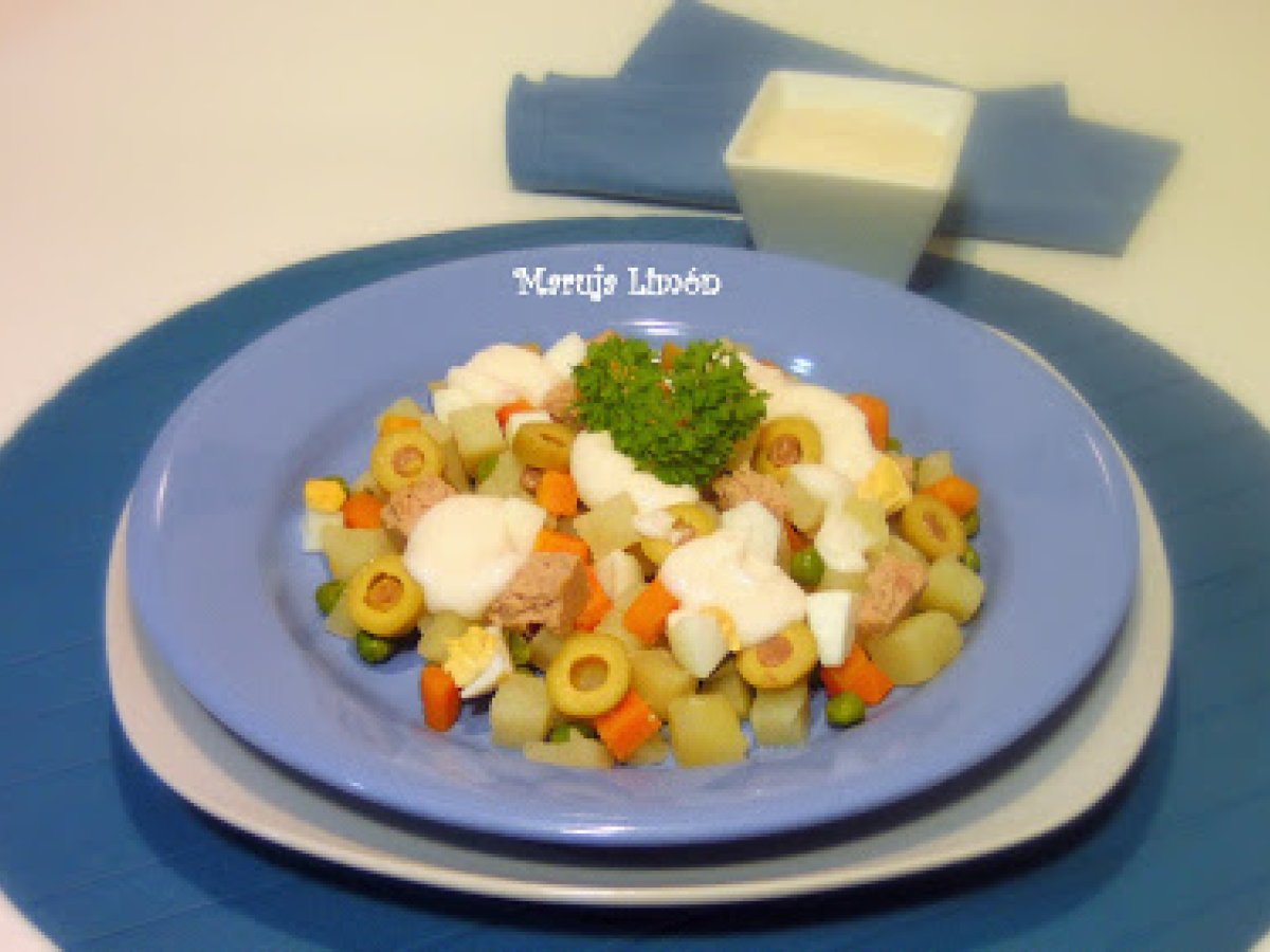 Ensaladilla con salsa de yogur EntranteMedio32 min Enviar esta receta a un amigo Imprimir esta página Preguntar al autor Publicar la foto de esta receta Ingredientes 2 ¾ kg de patatas 2 zanahorias medianas 2 huevos 1 latita de guisantes 300 g de mahonesa 1 yogur natural 1 lata de atún 100 g de aceitunas troceadas Sal