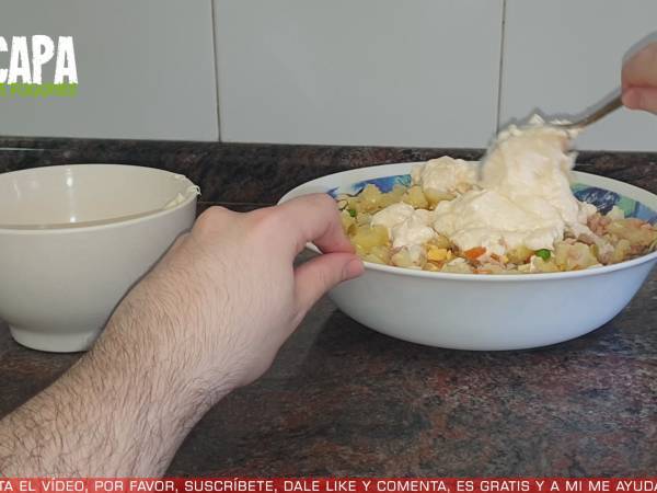 Añadimos 5 cucharadas de mayonesa al recipiente y lo mezclamos todo bien.