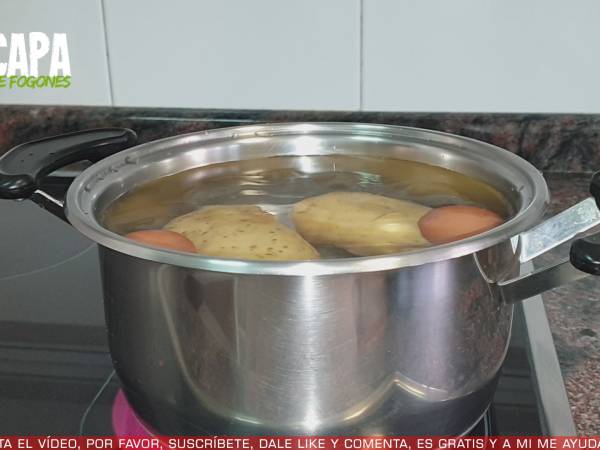 Y cuando empiece a hervir dejamos que los huevos se cuezan unos 10 minutos, la zanahoria unos 15 y las patatas como son bastante grandes las dejaremos unos 25 o 30 minutos.