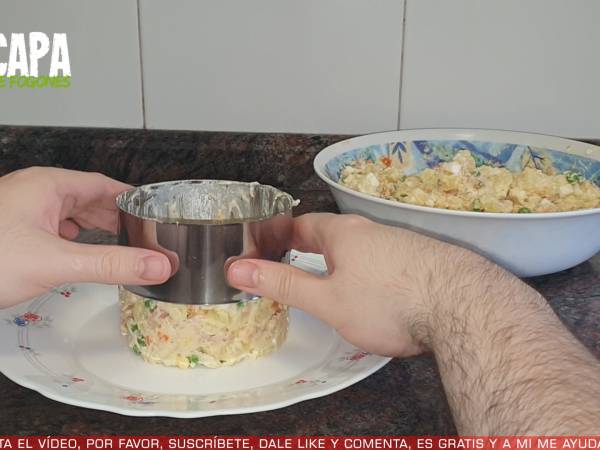 Añadimos la ensaladilla dentro del molde y con cuidado lo desmoldamos.