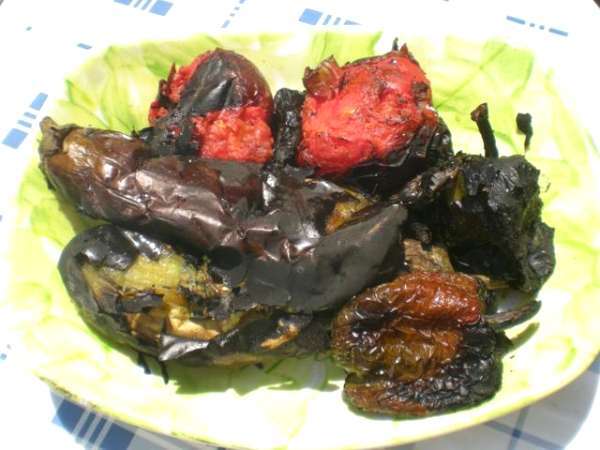 Encendemos un buen fuego y en la parrilla vamos poniendo las hortalizas para que se hagan a la llama. Siempre controlando el punto de cocción de cada hortaliza que será diferente según la variedad y el tamaño. - En una bandeja vamos poniendo las hortalizas hachas que tapamos con un trapo para que después no cuesten tanto pelarlas.