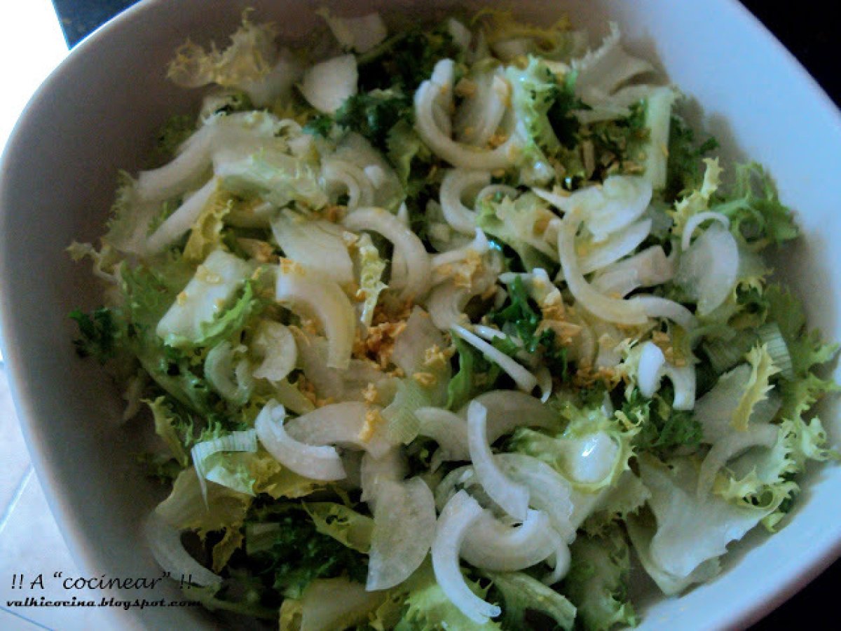- Aliña con sal y vinagre, y dora los ajos. Vierte el aceite con los ajos por encima de la escarola...