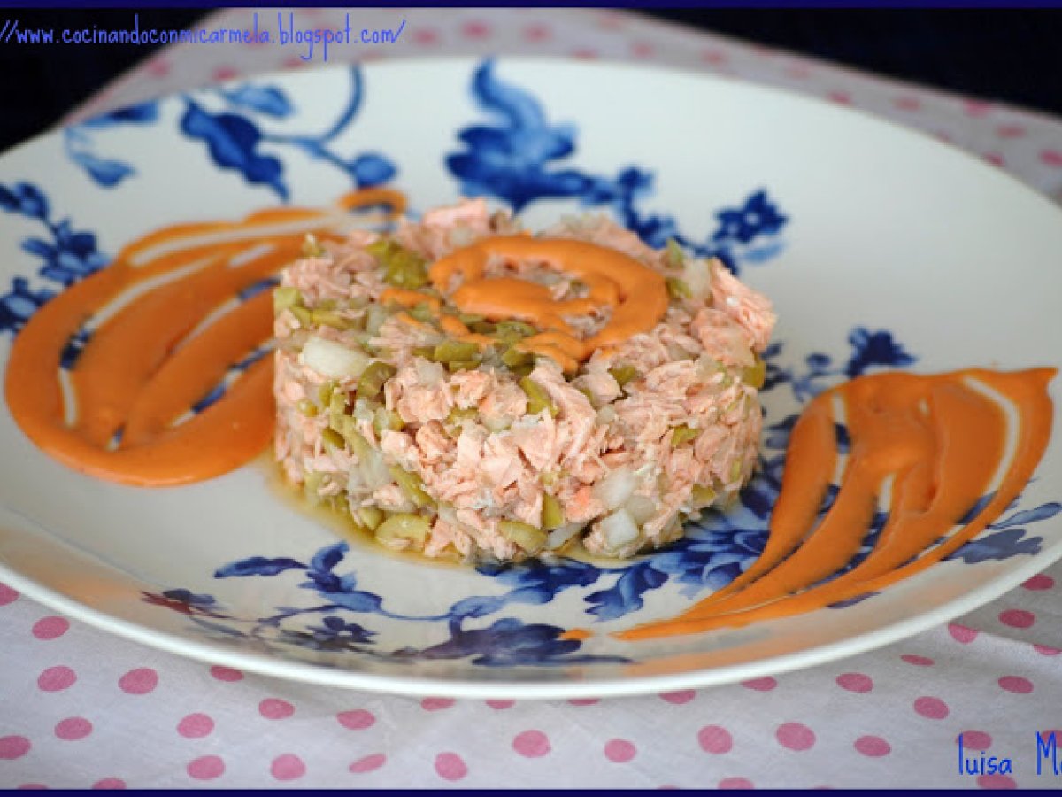 Buenas os dejo aquí otra propuesta muy fácil de realizar y queda muy resultona, para una cena de amigos, de pareja, etc... Es un falso tartar , debería ir con el salmón en crudo pero como no sabia si iba a gustar lo cocine un poco.