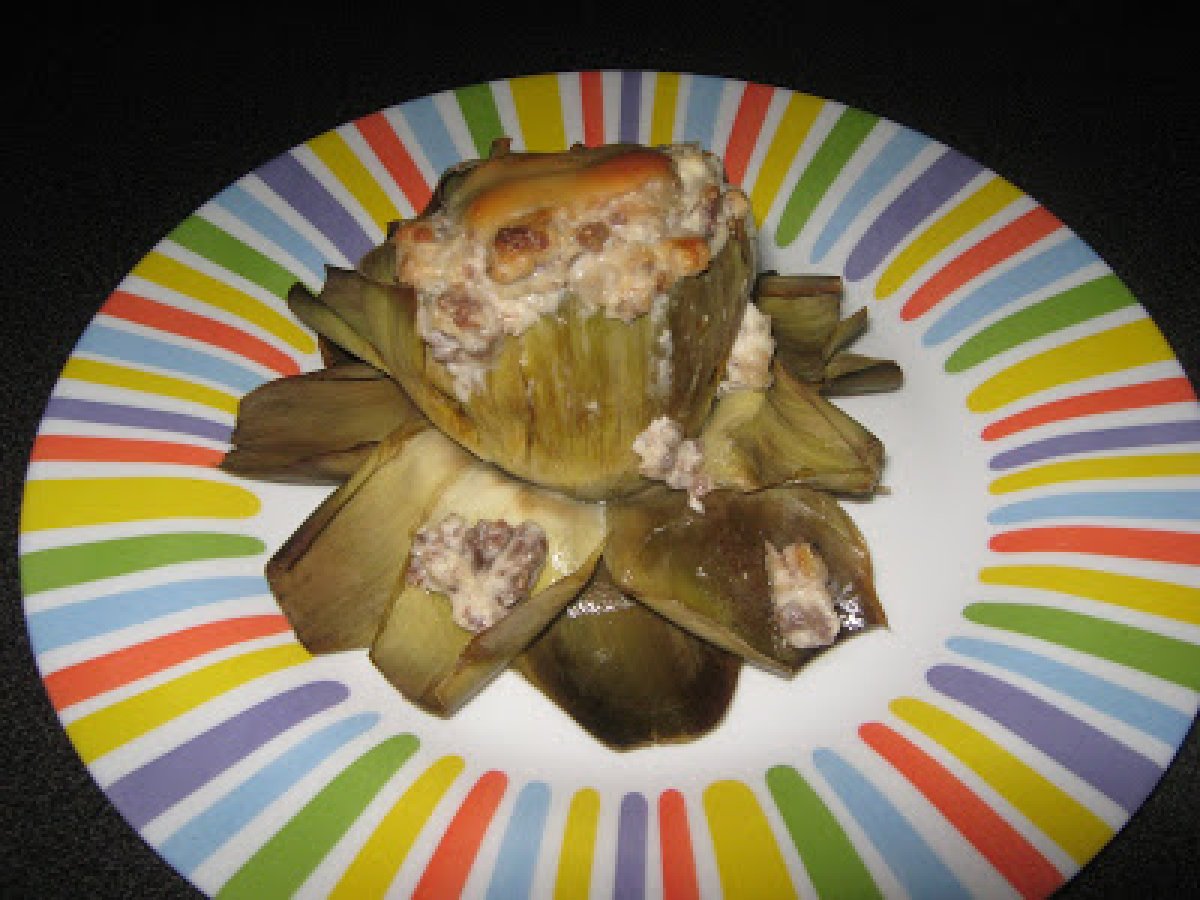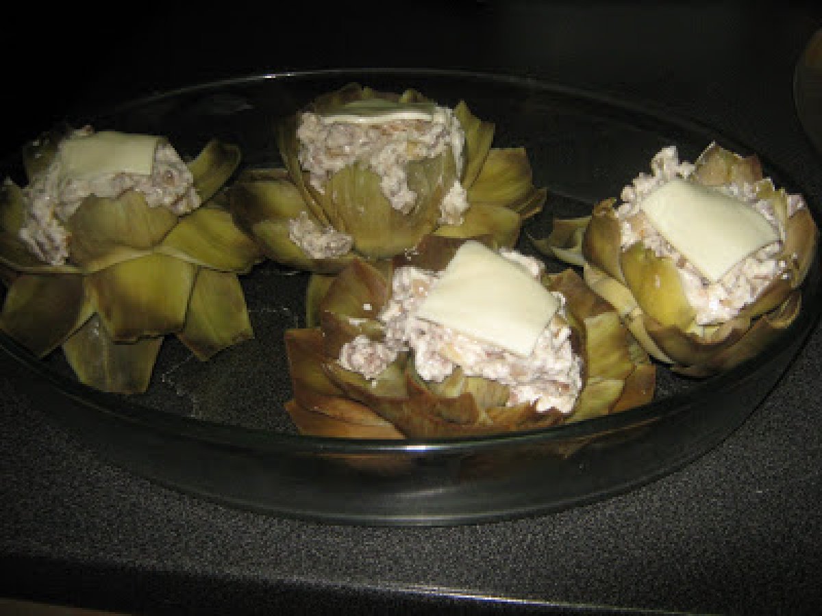 Flores de alcachofas rellenas vota ahora AnteriorSiguiente EntranteFácil50 min150 Kcal Enviar esta receta a un amigo Imprimir esta página Preguntar al autor Publicar la foto de esta receta Ingredientes 4 4 alcachofas 150 g de carne picada de ternera 3 chalotas 1/2 tarrina de queso mascarpone 1 loncha de queso sal pimienta negra unas gotas de limón