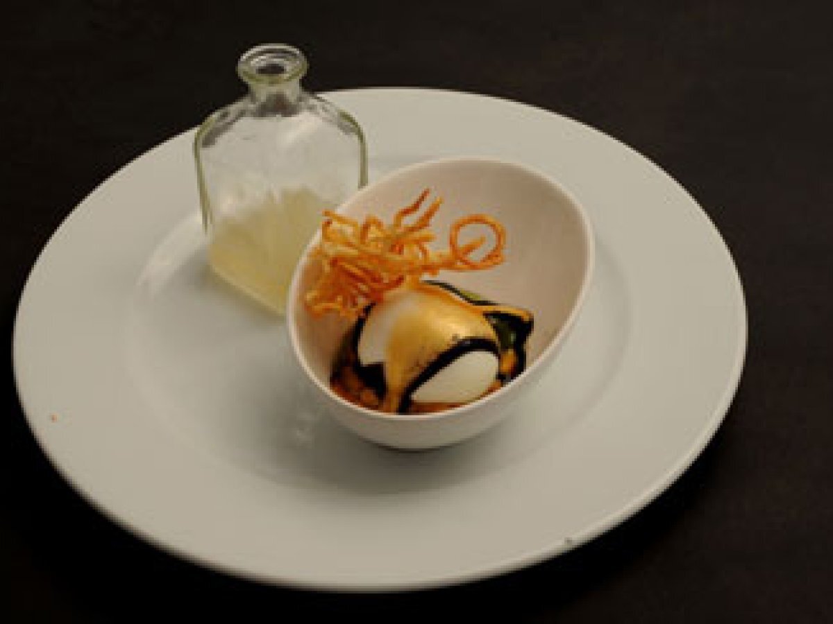 Huevo al oro con migas de pastor y chipirón vota ahora EntranteFácil45 min Enviar esta receta a un amigo Imprimir esta página Preguntar al autor Publicar la foto de esta receta Ingredientes 4 4 huevos de pollita agua sal vinagre polvo de oro 40 g de tapioca 120 g de agua 150 g de azúcar glaseé 80 g de migas de pan hechas o compradas 80 g de chipirones grandes 80 g de cebolla picada y estofada 2 patatas Tinta de chipirón Aceite de perejil Un buen caldo del día