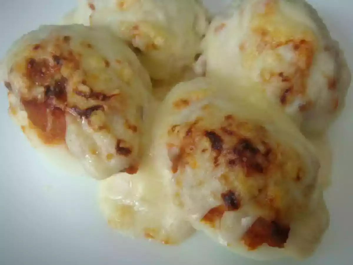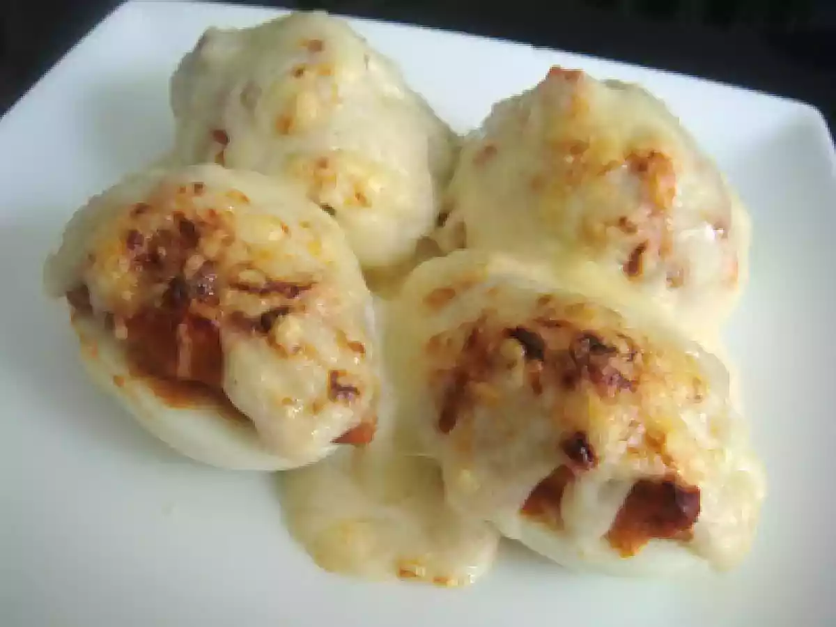 Huevos rellenos de carne picada AnteriorSiguiente EntranteFácil1 hora1125 Kcal Enviar esta receta a un amigo Imprimir esta página Preguntar al autor Publicar la foto de esta receta ¡Un entrada de verdad delicioso! Ingredientes 2 400 g de Carne picada de Ternera y Cerdo 12 Huevos ½ Cebolla Aceite de Oliva Pimienta Negra Sal Salsa de Tomate Salsa Bechamel Costo estimado: 5.46Euros€ (2.73€/porción)