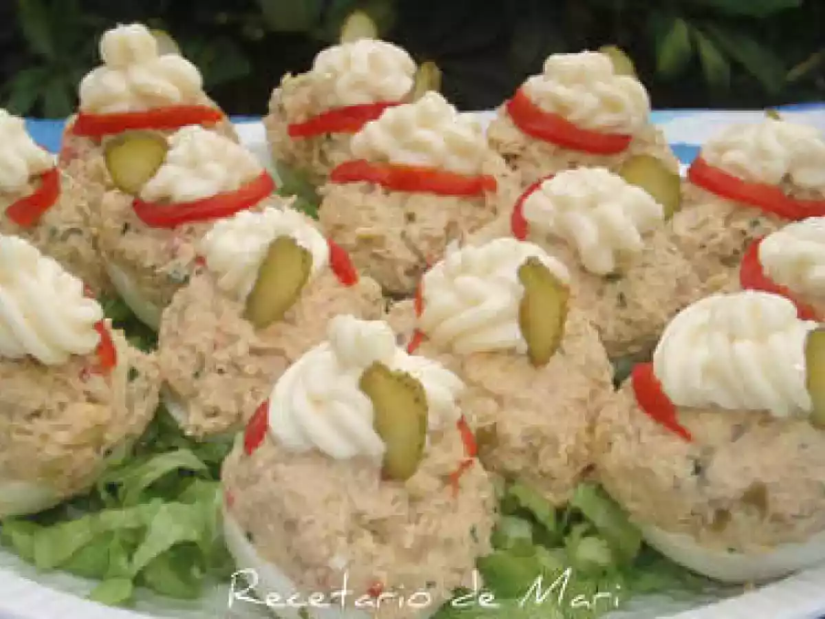 Huevos rellenos EntranteMedio20 min99 Kcal Enviar esta receta a un amigo Imprimir esta página Preguntar al autor Publicar la foto de esta receta Ingredientes 8 6 huevos medianos 1 cebolla Aceitunas pepinillos perejil 1 lata pequeña de pimiento morrón 1 lata grande de atún Mayonesa Costo estimado: 3.81Euros€ (0.48€/porción)