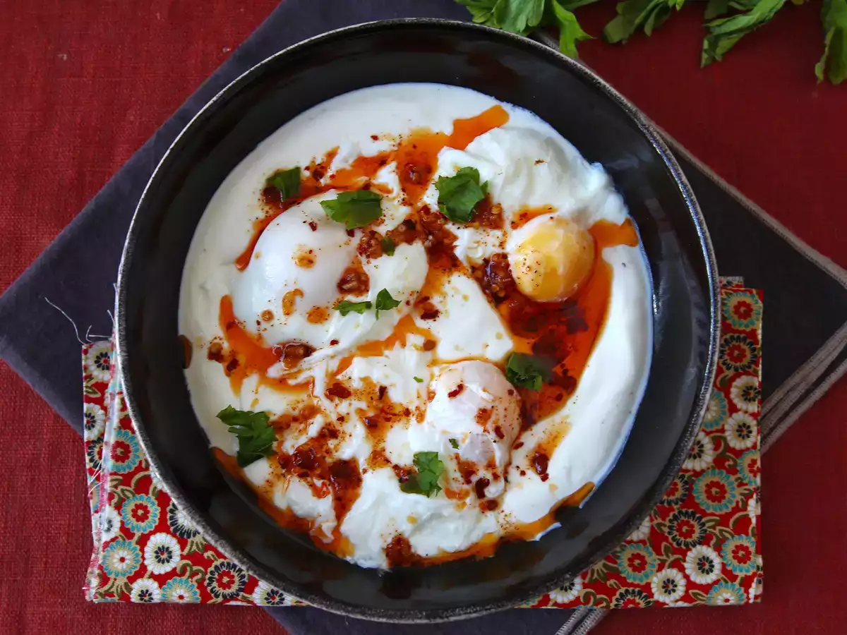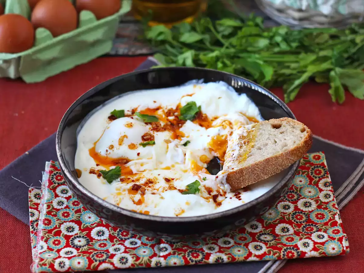 Huevos turcos (çılbır) con yogur griego y salsa picante