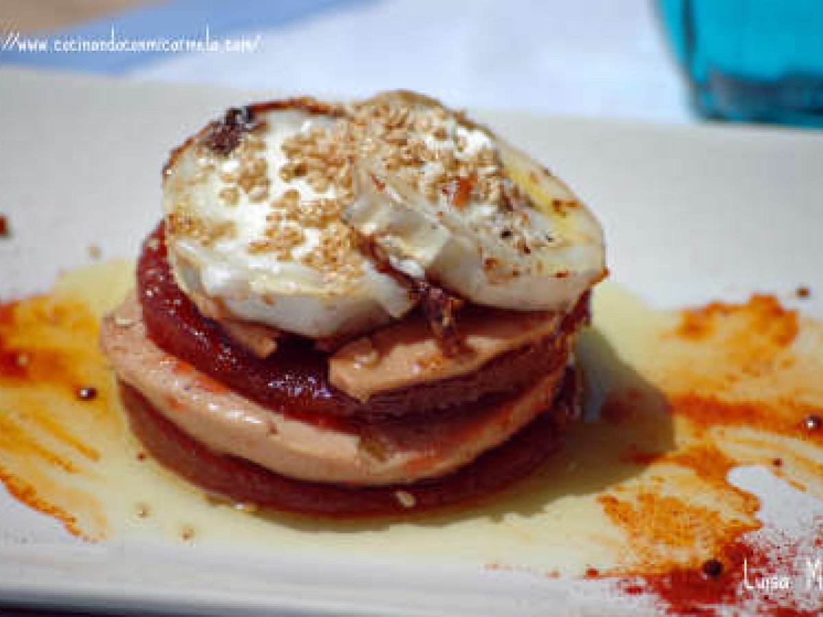 Milhojas de foie, membrillo y queso de cabra al pimentón. EntranteFácil40 min Enviar esta receta a un amigo Imprimir esta página Preguntar al autor Publicar la foto de esta receta Ingredientes 1 Carne de membrillo. Queso de cabra de rulo. Foie. Semillas de sésamo.