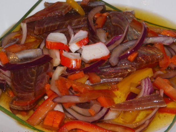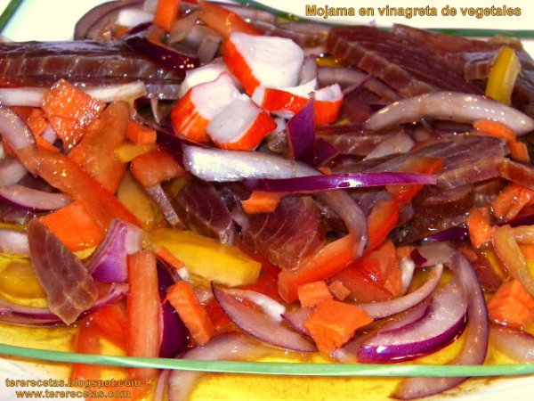 El origen de la mojama se encuentra en tiempos de los romanos, quienes salaban los lomos del atún rojo y lo dejaban secar al sol. Fueron los árabes quienes siguieron conservando el atún de este modo, y fueron ellos quienes lo denominaron "mussama", palabra de la cual derivó su nombre en español. Preparada con esta rica vinagreta, queda riquísima!!