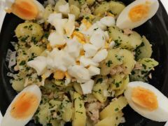 "papas aliñás" patatas aliñadas de cadiz EntranteFácil35 min211 Kcal Enviar esta receta a un amigo Imprimir esta página Preguntar al autor Publicar la foto de esta receta Ingredientes 4 4 patatas (4-5 medianas) 1/4 de cebolla 2 huevos Perejil sal Vinagre Aceite de oliva virgen extra Costo estimado: 1.46Euros€ (0.36€/porción)