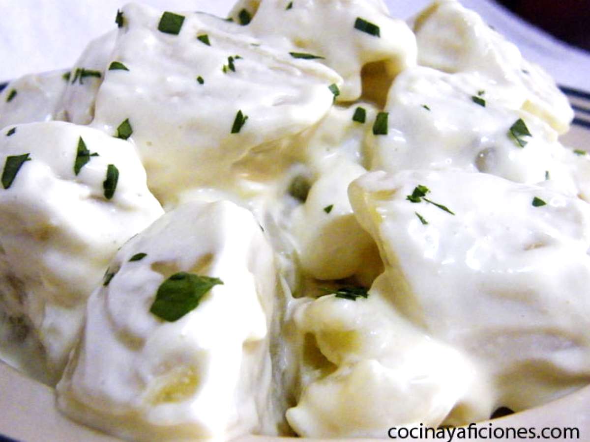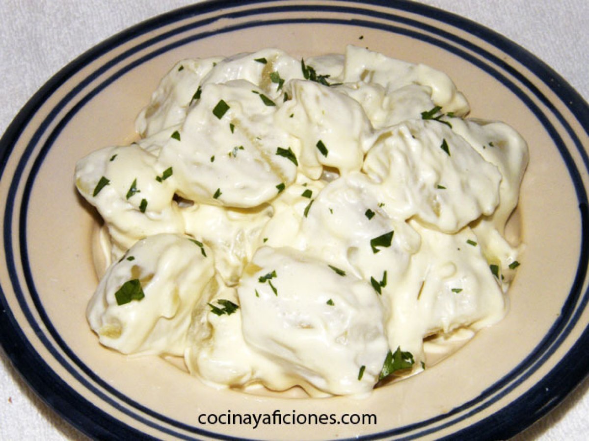 Patatas con alioli. mahonesa de ajo AnteriorSiguiente EntranteFácil30 min235 Kcal Enviar esta receta a un amigo Imprimir esta página Preguntar al autor Publicar la foto de esta receta Ingredientes 1 ½ kg. Patas pequeñas, 1 huevo, aceite, limón, sal, 6 dientes de ajo, perejil. ELABORACIÓN: Costo estimado: 5Euros€ (5€/porción)