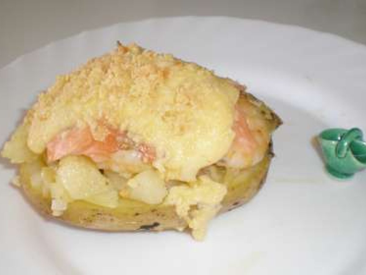 Patatas rellenas holandesas EntranteMedio1 h 25 m Enviar esta receta a un amigo Imprimir esta página Preguntar al autor Publicar la foto de esta receta Ingredientes 7 Ingredientes (4 personas): 3 patatas grandes ½ cebolla grande 2 cucharadas grandes de alcaparras (podéis cambiarlo por anchoas o aceitunas verdes) 2 cucharadas grandes de guisantes 100 gr de queso gorgonzola (este queso es bastante fuerte, podéis sustituirlo por emmental) 18 gambas 100 gr de salmón ahumado Sal Pimienta 6 cucharadas grandes de aceite de oliva Queso rallado (emmental o parmesano) Ingredientes para la salsa holandesa: 4 yemas de huevo 50 gr de agua 130 gr de mantequilla ½ cucharadita de sal Pimienta Zumo de ½ limón