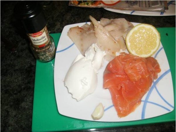 Paté de ahumados (thermomix) AnteriorSiguiente EntranteFácil10 min798 Kcal Enviar esta receta a un amigo Imprimir esta página Preguntar al autor Publicar la foto de esta receta Un paté muy rico y muy rápido de hacer Ingredientes 1 125 gr. De bacalao ahumado 150 gr. De queso Philadelphia 125 gr. De salmón ahumado 1/2 limón solo el zumo 1 diente de ajo 1 cucharadita de mantequilla Pimienta Costo estimado: 9.02Euros€ (9.02€/porción)
