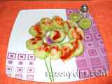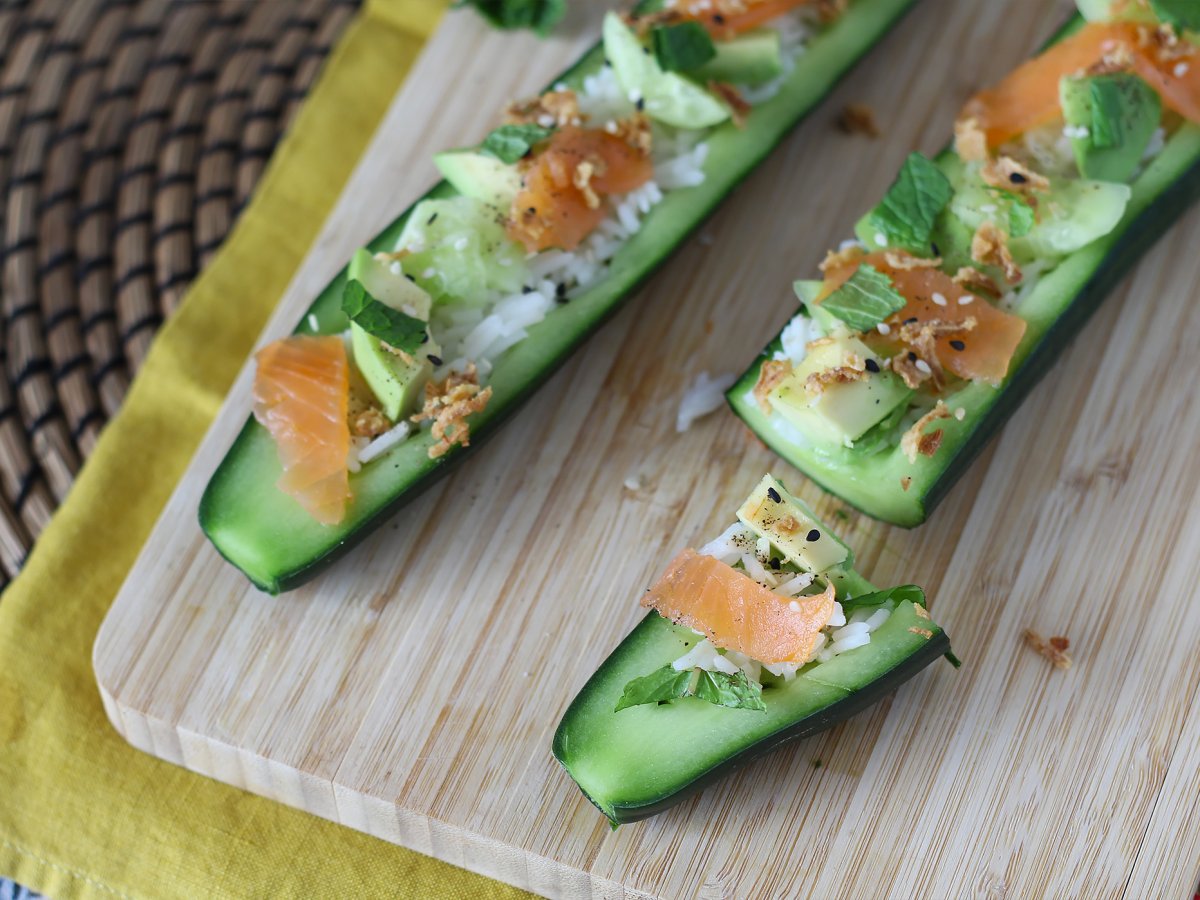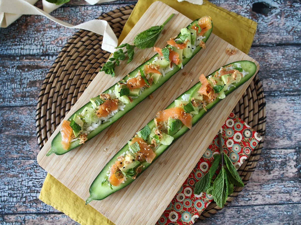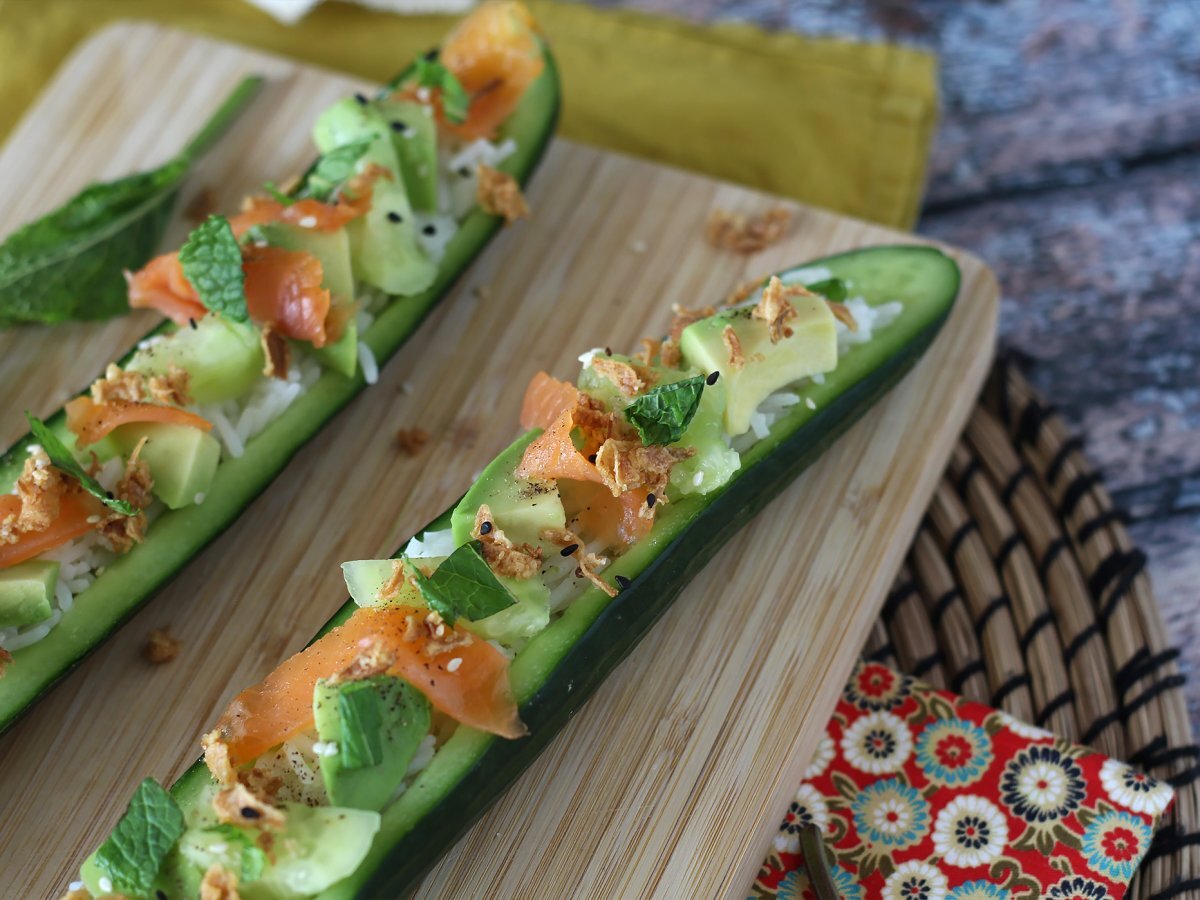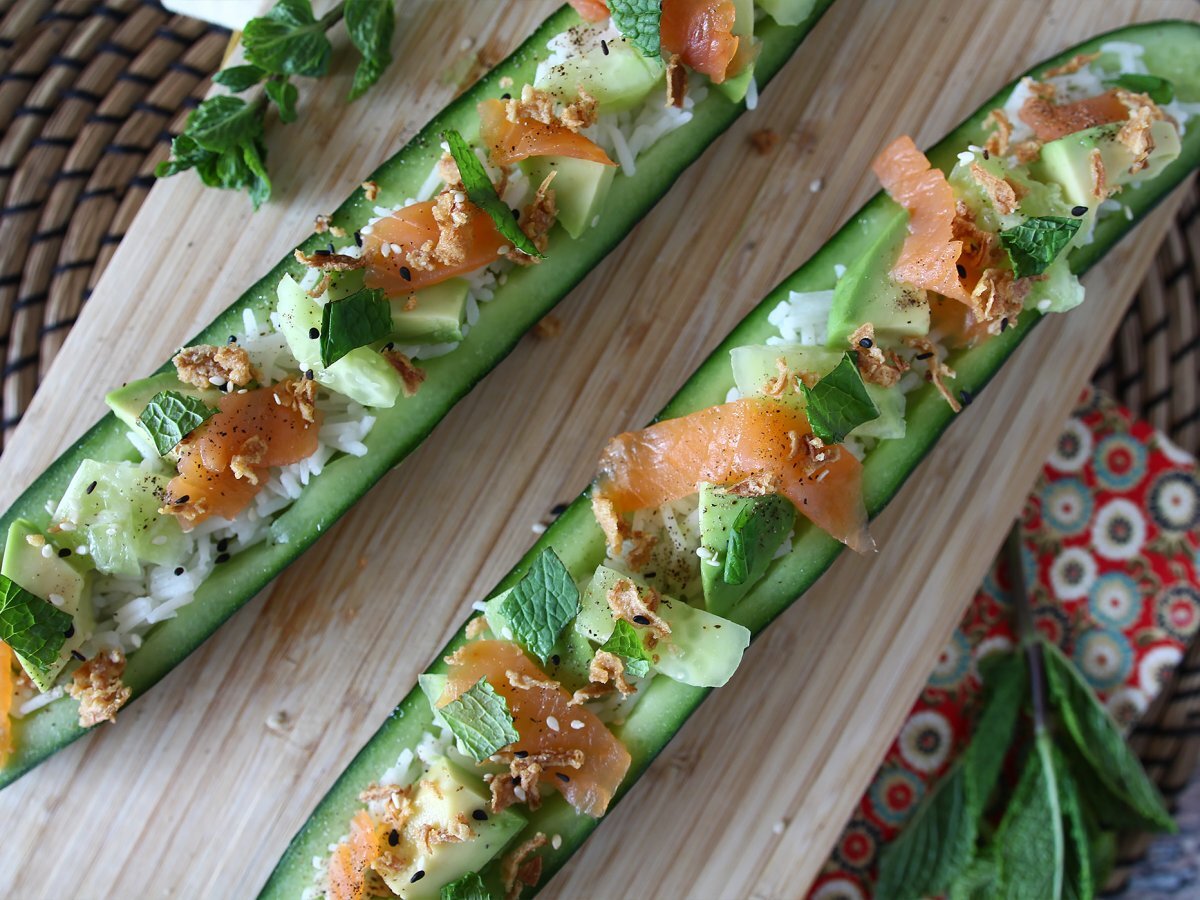Pepinos rellenos de arroz, salmón ahumado, aguacate y menta