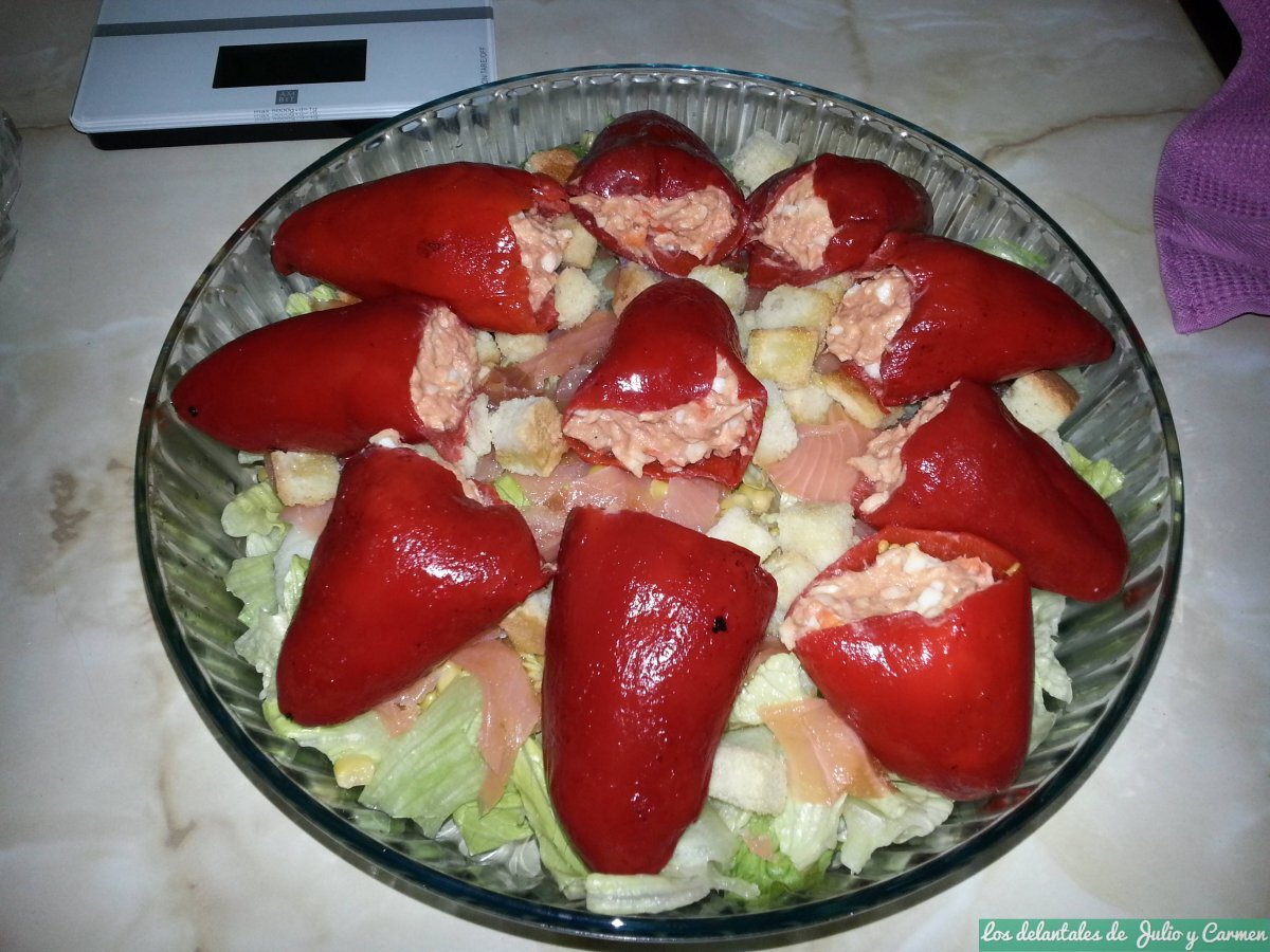 Pimientos del piquillo rellenos de atún sobre ensalada de ahumados