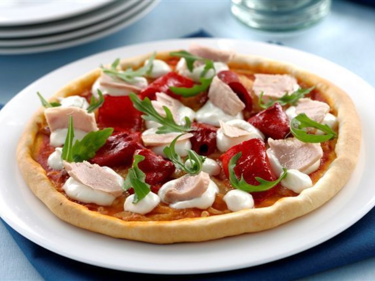 Pizza de pimientos asados, atún y rúcula con philadelphia EntranteMedio30 min387 Kcal Enviar esta receta a un amigo Imprimir esta página Preguntar al autor Publicar la foto de esta receta Ingredientes 4 120 g de Philadelphia Original 1 base de masa para pizzas 3 cucharadas de tomate frito rúcula 100 g de atún en aceite 1 pimiento rojo grande. Costo estimado: 5.82Euros€ (1.46€/porción)