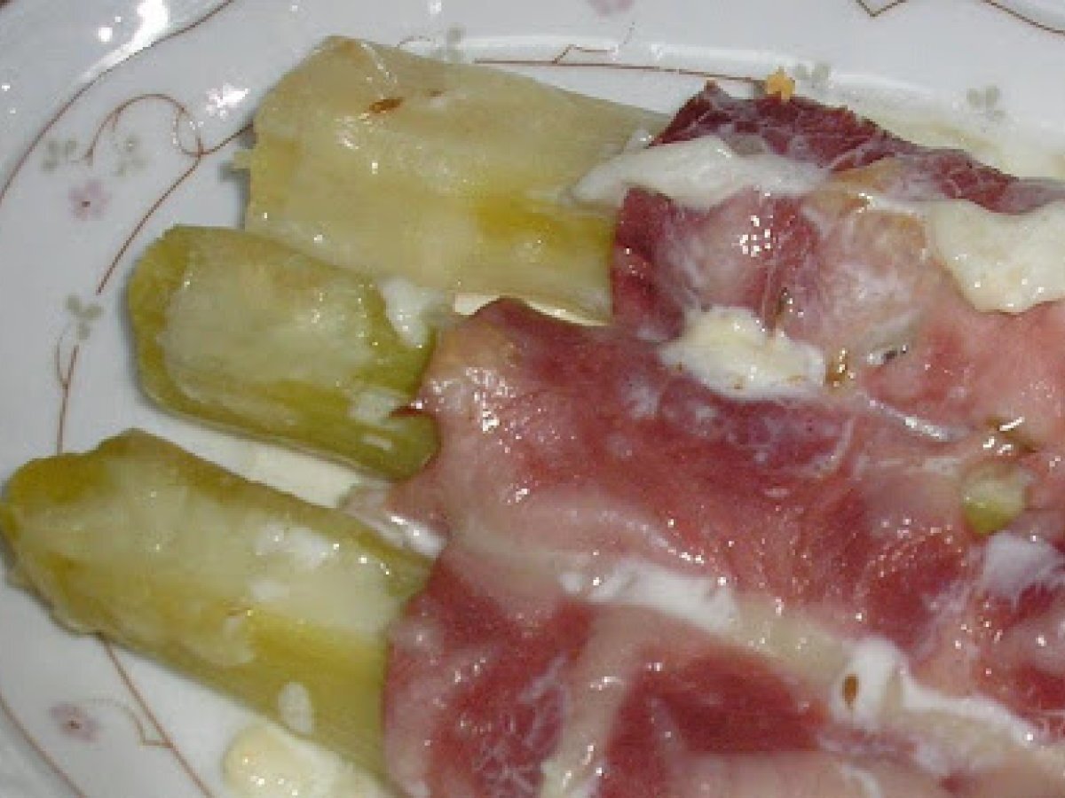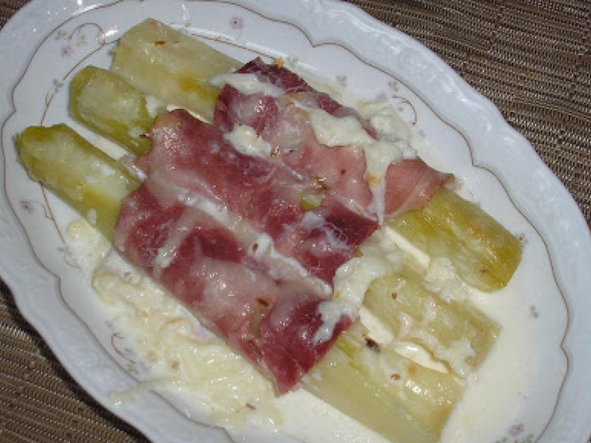 Puerros envueltos en lacón AnteriorSiguiente EntranteFácil45 min Enviar esta receta a un amigo Imprimir esta página Preguntar al autor Publicar la foto de esta receta Ingredientes 4 cuatro puerros medianos ocho lonchas de lacón 30 g de queso rallado un vasito de nata una pizca de comino una cucharadita de mantequilla sal