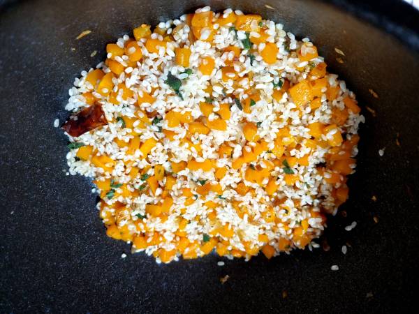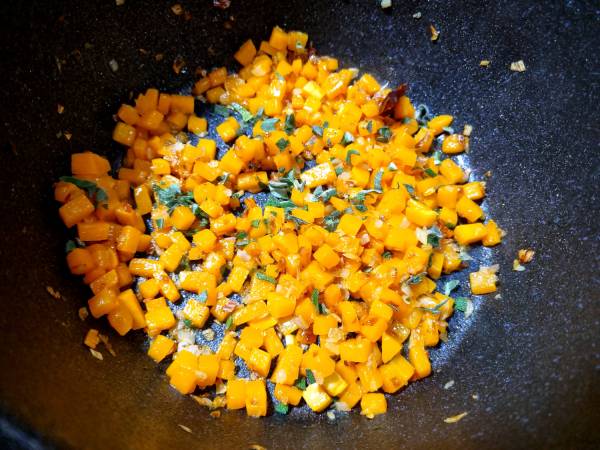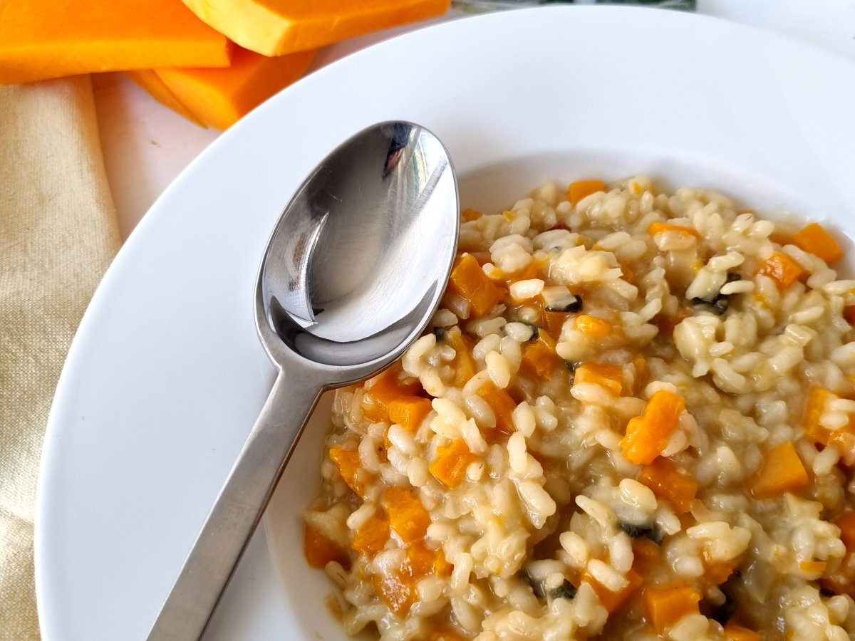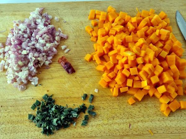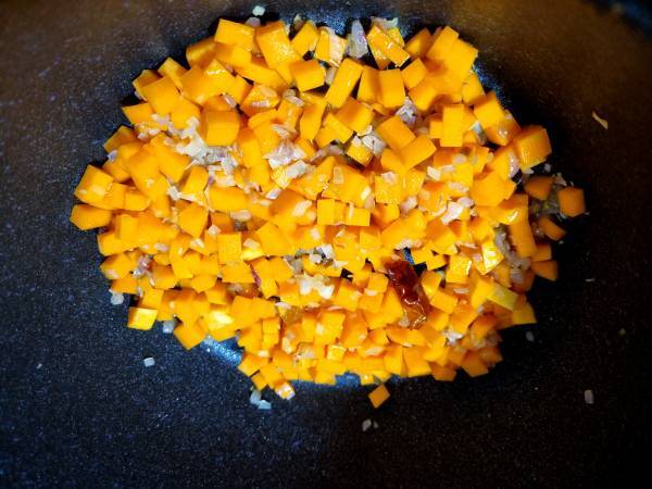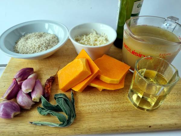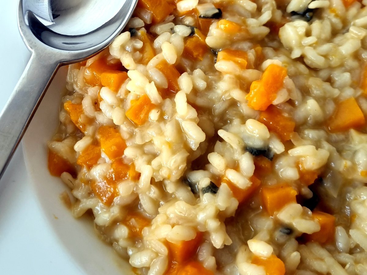 Y por fin acabé la calabaza que tenía. La verdad es que los risottos son perfectos para utilizar esos restos que te quedan, ya sea verduras, pollo, jamón... lo que sea. Es fácil, rápido y rico. La única pega que le puedes poner es que tienes que estar dando vueltas al arroz todo el rato para que vaya soltando el almidón y quede con esa consistencia cremosa típica del risotto. Los italianos usan arroz arborio o carnaroli pero el arroz nuestro tipo "bomba" en mi opinión es un buen sustituto. Yo he usado los dos tipos de arroz, el italiano y el español, y no he notado tanta diferencia también es verdad que yo no soy una experta catadora. Lo importante es que no sea arroz largo o vaporizado. Necesitarás usar un caldo muy caliente e ir agregando cacitos poco a poco, a medida que el arroz lo vaya absorbiendo. Y sin parar de remover para que vaya saliendo melosito. Este arroz es para dos personas pero hay que hacer un segundo porque sabe a poco. Y tampoco es cuestión de ponerte un perolón de risotto para quedarte satisfecha. El tipo de queso puede ser el que os dé la gana, así como las hierbas. En esta ocasión yo he usado un queso light porque estoy en un momento "colesterol". Lo clásico suele ser parmesano. Tampoco he pochado la verduras en mantequilla, que es lo clásico, si no en aceite. Sólo he añadido un nuez de margarina al final de la cocción.