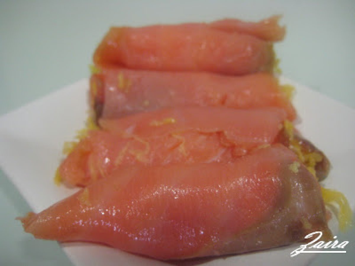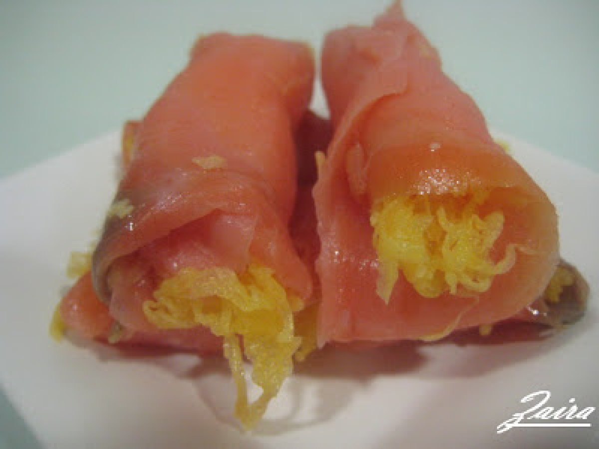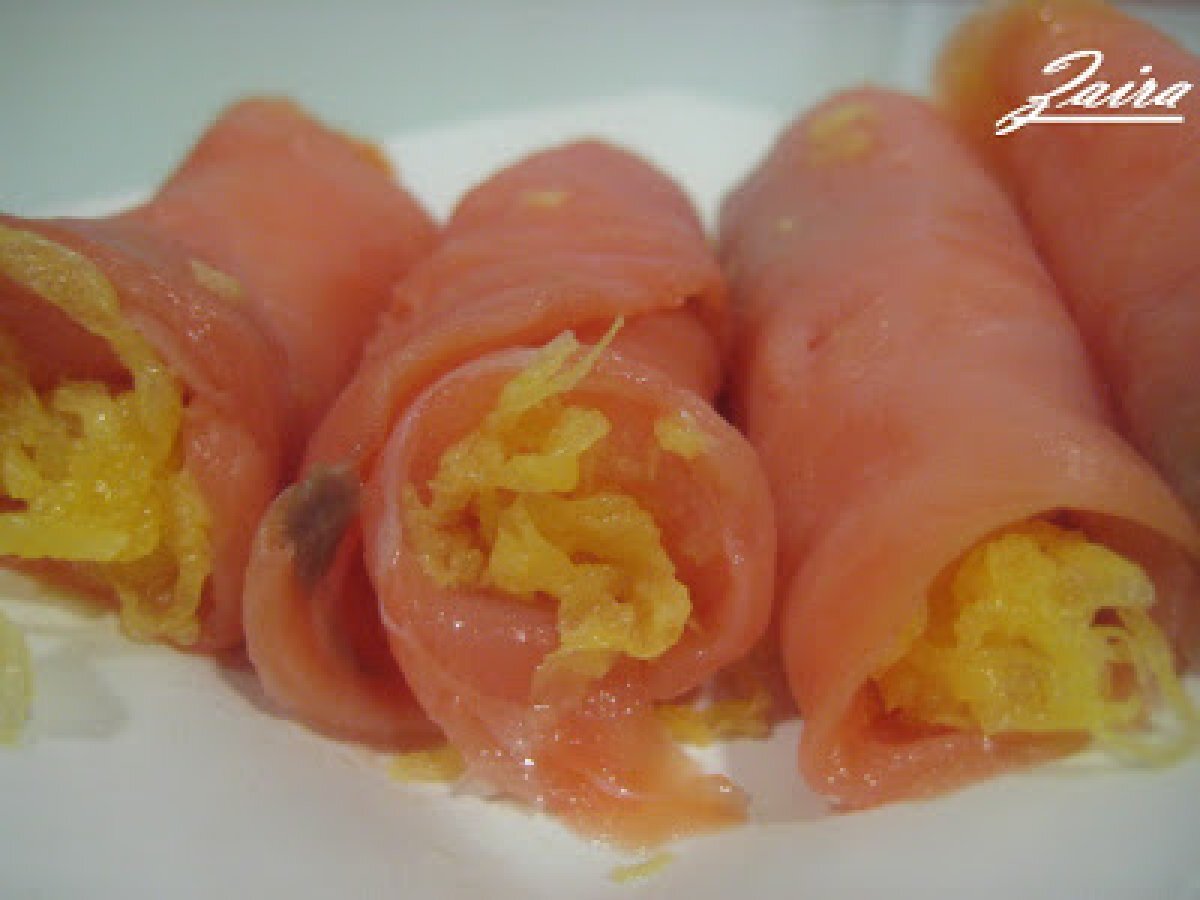 Rollitos de salmón ahumado con queso y huevo hilado AnteriorSiguiente EntranteFácil7 min1024 Kcal Enviar esta receta a un amigo Imprimir esta página Preguntar al autor Publicar la foto de esta receta Un ingreso muy muy simples y quitando Ingredientes 2 18 lonchas finas de salmón ahumado 300 gr. de queso fresco para untar 150 gr. de huevo hilado Costo estimado: 34.35Euros€ (17.18€/porción)
