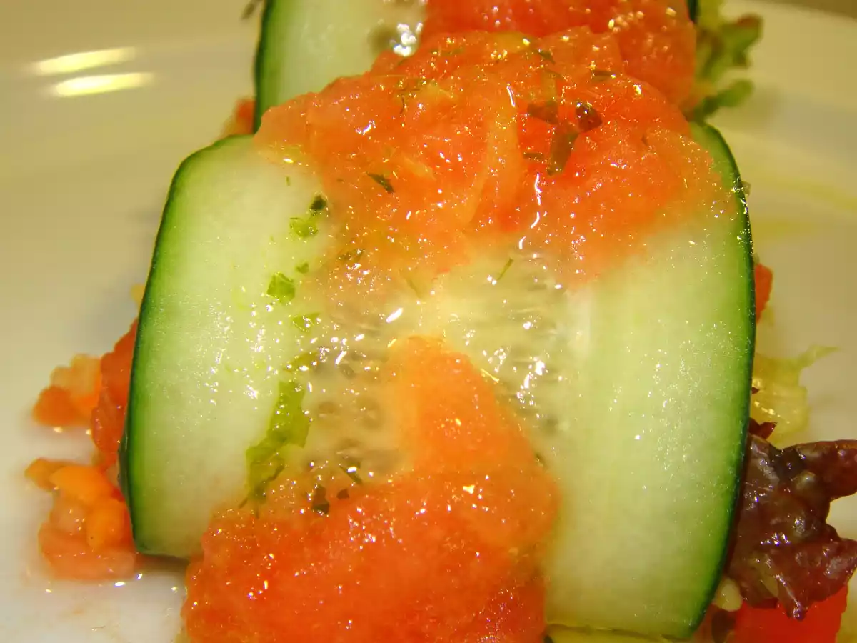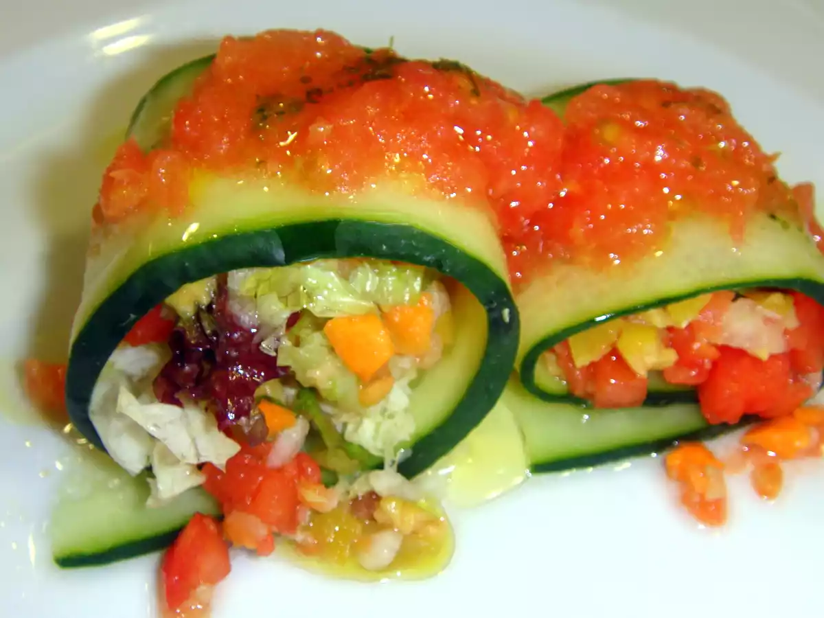 Rollitos de sushi, pepino y verduras AnteriorSiguiente EntranteFácil15 min Enviar esta receta a un amigo Imprimir esta página Preguntar al autor Publicar la foto de esta receta Ingredientes 2 Ingredientes 1 pepino 2 tomates pera cebolleta 2 hojas de lechuga olivas rellenas 2 zanahorias 4 nueces sal, aceite, pimienta verde