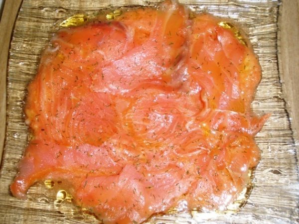 Salmón ahumado sobre cama de tomate aliñado EntranteFácil10 min99 Kcal Enviar esta receta a un amigo Imprimir esta página Preguntar al autor Publicar la foto de esta receta Ingredientes 2 Salmón ahumado Tomate natural Aceite Sal Eneldo 2 ajos Costo estimado: 2.6Euros€ (1.3€/porción)
