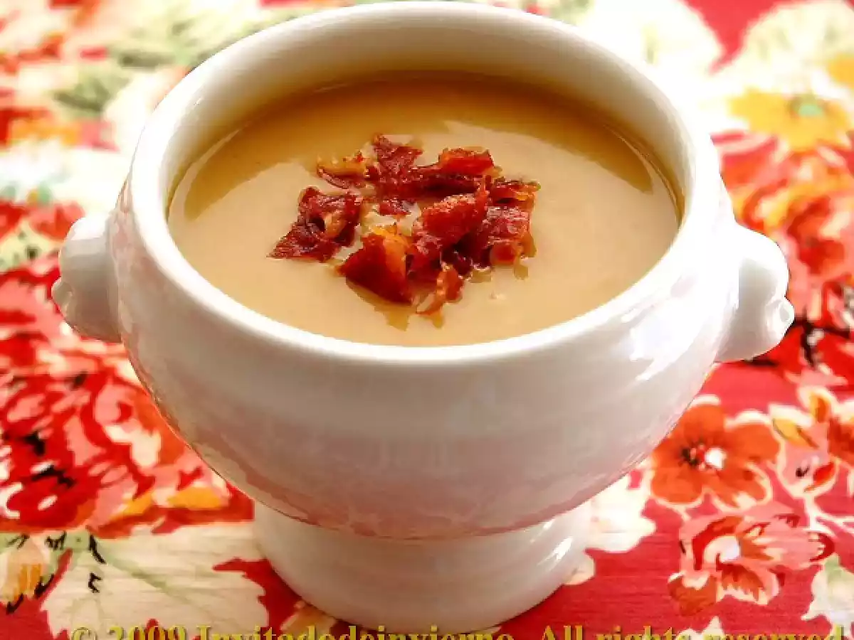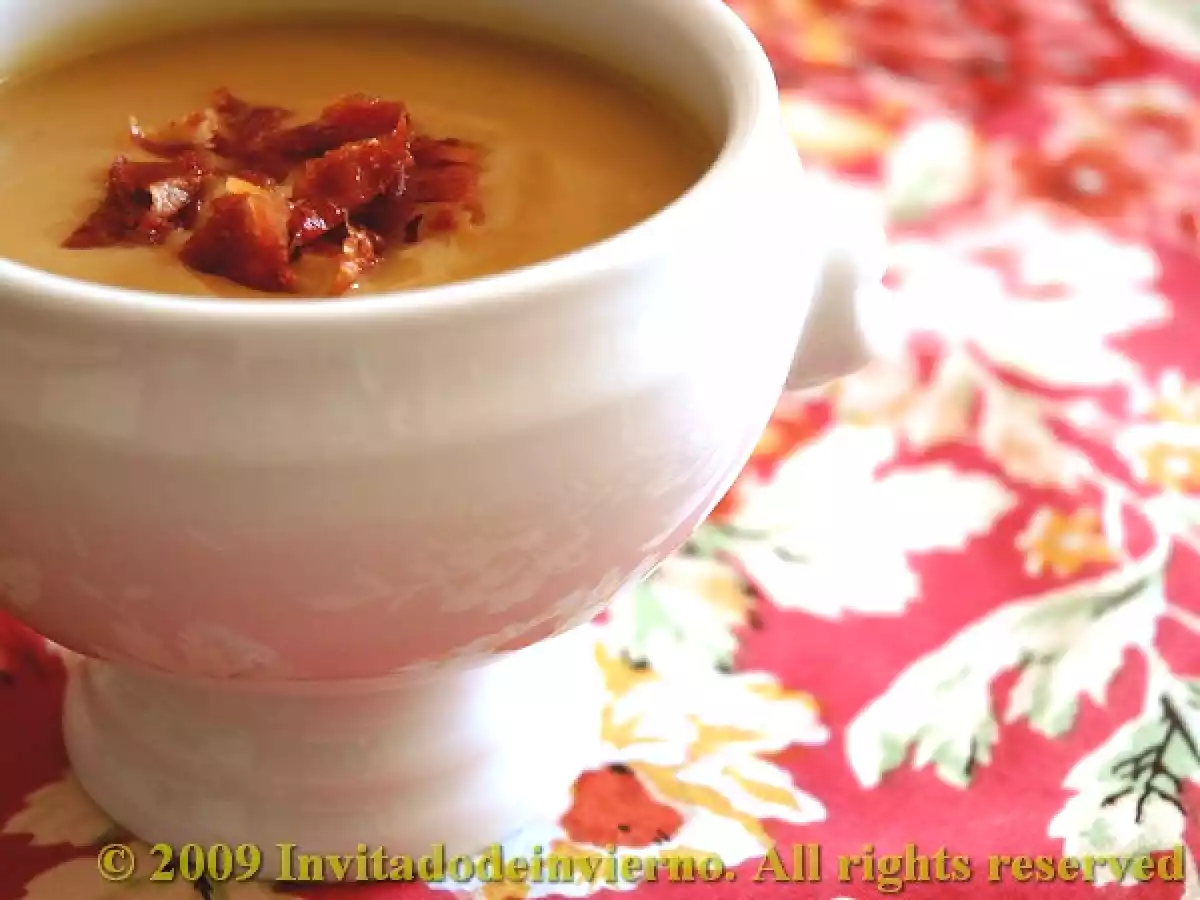 Sopa de castañas y calabaza AnteriorSiguiente EntranteFácil40 min231 Kcal Enviar esta receta a un amigo Imprimir esta página Preguntar al autor Publicar la foto de esta receta Ingredientes 3 1/2 kg de calabaza 250 g de castañas pilongas (equivalían aproximadamente a 400 g una vez hidratadas, aunque yo las prefiero - pilongas porque ya vienen peladas) 1 cebolla grande 1 buen vaso de vino dulce (bueno, dos vasos, uno pá la sopa y otro para el cocinero… yo usé Dos pasas de - Cobos, pero cualquier oporto o moscatel puede valer) 1 pellizco de nuez moscada 1 l de agua o caldo de pollo o verduras Sal al gusto