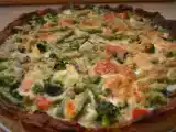 Tarta de verduras con queso y aceitunas EntranteMedio1 h 5 m358 Kcal Enviar esta receta a un amigo Imprimir esta página Preguntar al autor Publicar la foto de esta receta Ingredientes 6 1 Masa de Hojaldre La Cocinera 100 gr. de aceitunas sin hueso 1 puerro 1 pimiento rojo 1 lata de champiñones laminados Pimientos rojos de lata 1 berenjena 4 lonchas de queso 3 huevos orégano Aceite de oliva virgen extra Sal Costo estimado: 5.78Euros€ (0.96€/porción)