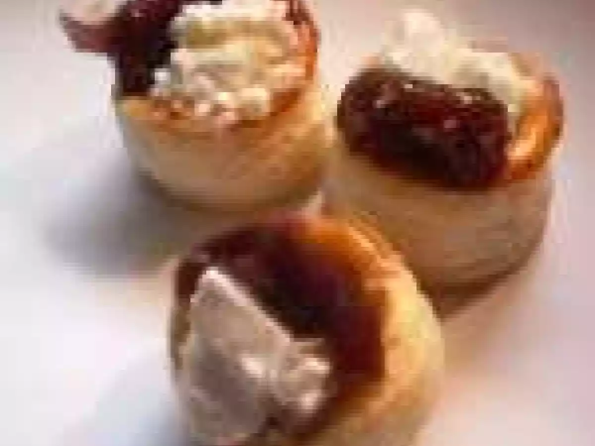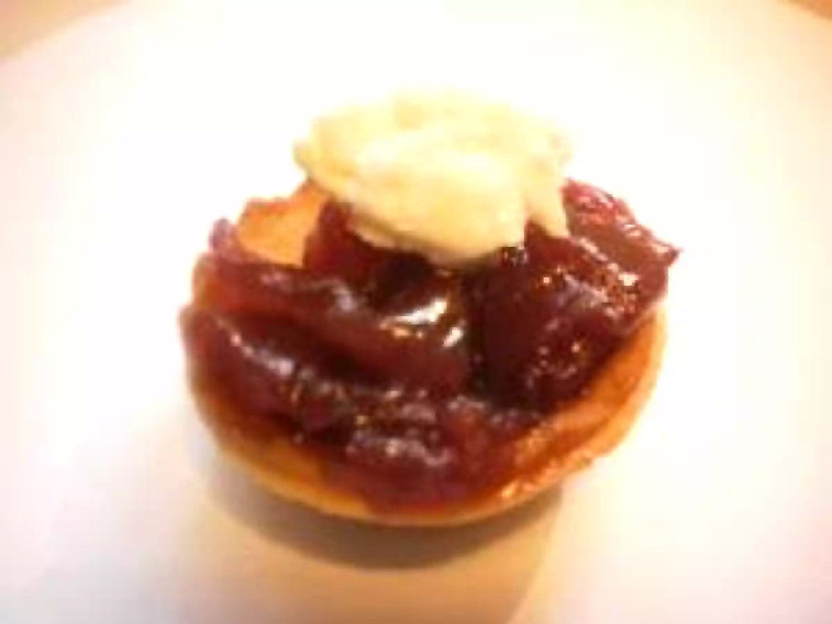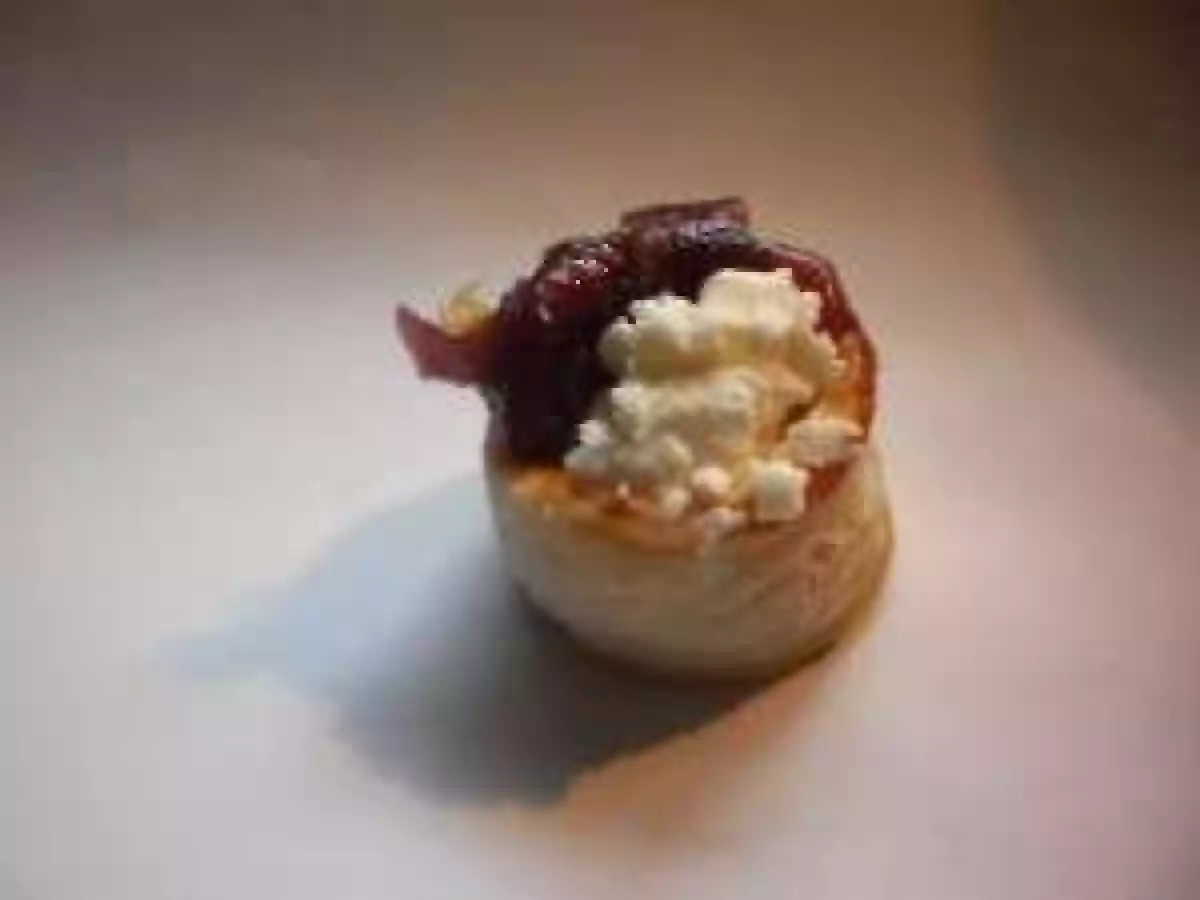 Tartaleta / volovan de queso de cabra con cebolla caramelizada AnteriorSiguiente EntranteFácil50 min435 Kcal Enviar esta receta a un amigo Imprimir esta página Preguntar al autor Publicar la foto de esta receta Ingredientes 4 16 mini tartaletas tartaleta de cebolla caramelizada queso rulo de cabra 1 rodaja gruesa de queso rulo de cabra 2 cebollas moradas Pimienta rosa 1 vaso de vino de cava 2 cucharadas de azúcar moreno Pimienta negra Sal aceite de oliva virgen extra