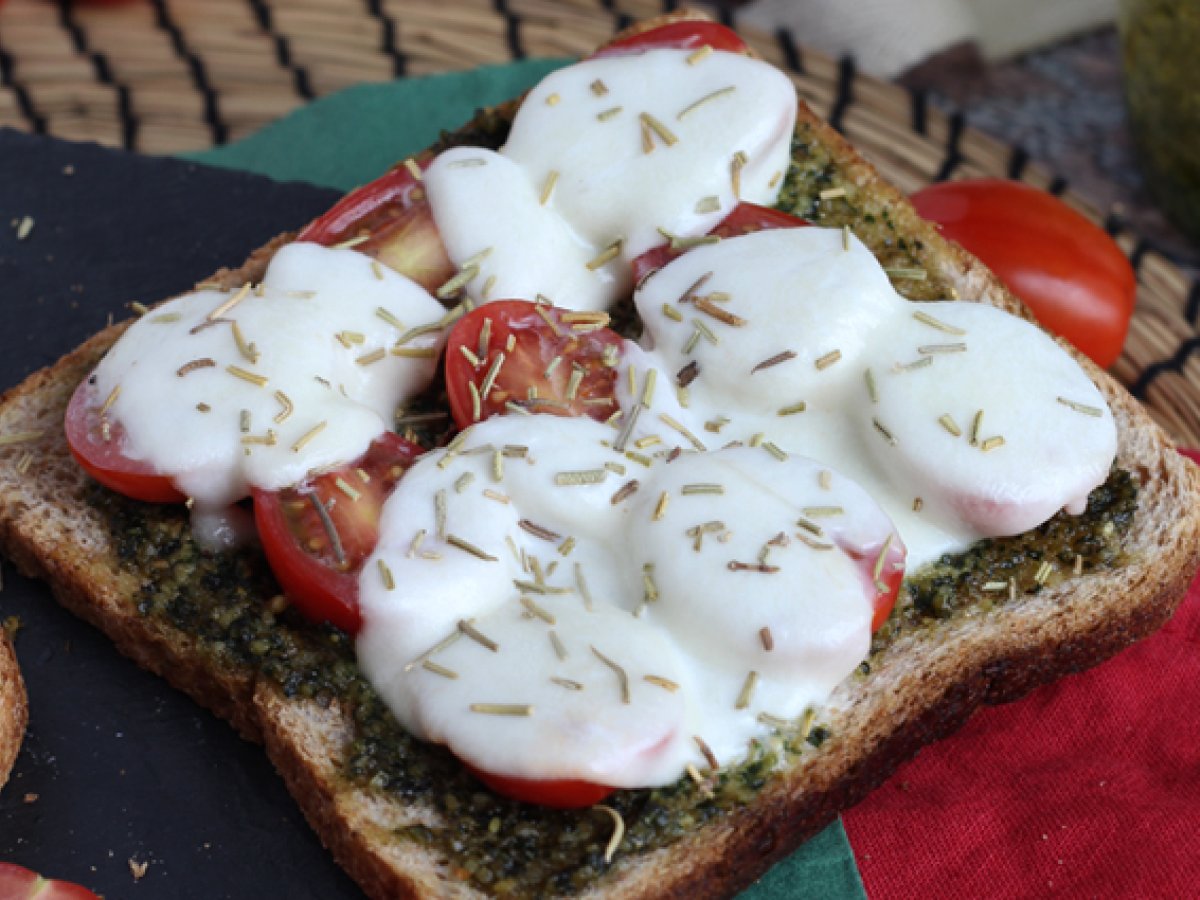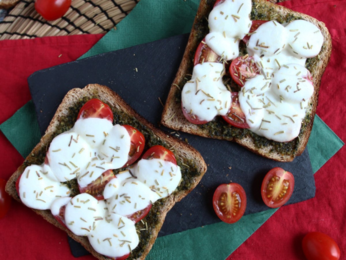 Tosta con pesto, tomates cherry y queso mozzarella