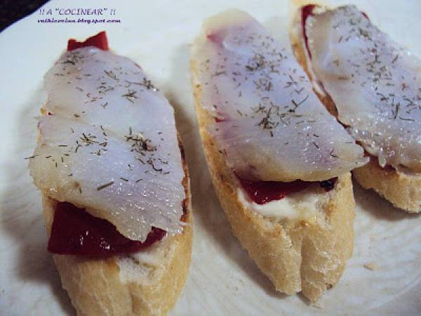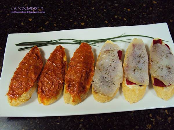 Tostas frías: bacalao ahumado/ piquillos y sobrasada/miel