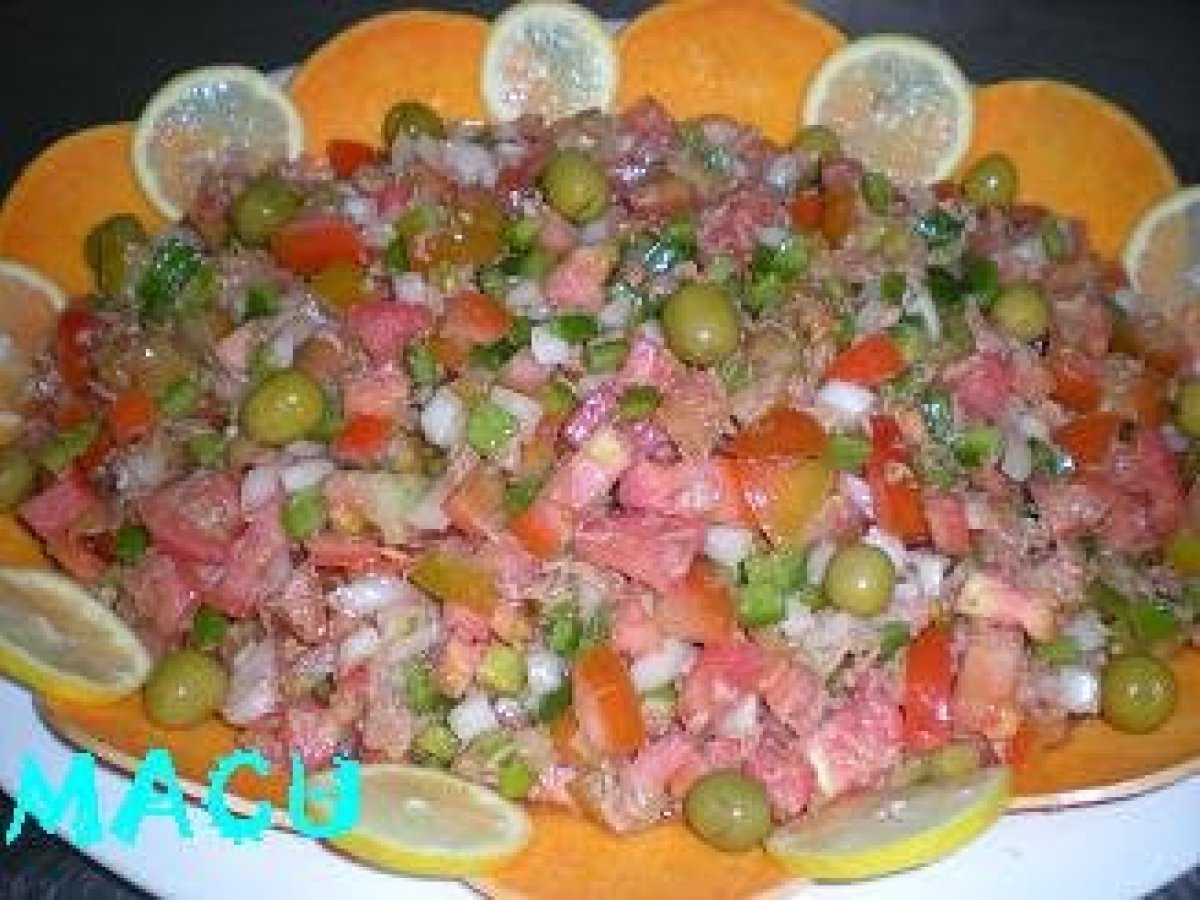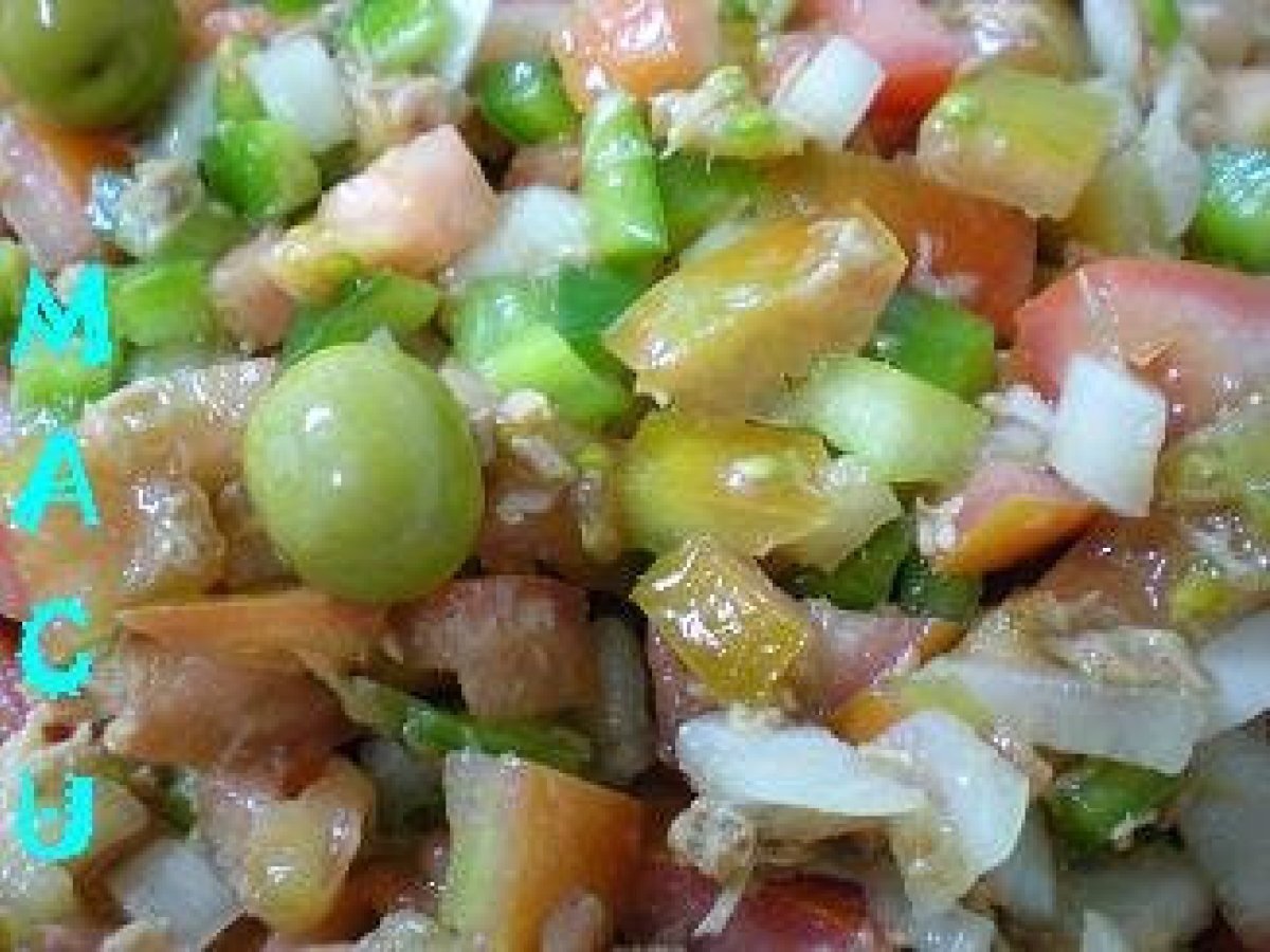 Trampó (ensalada típica de mallorca) AnteriorSiguiente EntranteFácil30 min Enviar esta receta a un amigo Imprimir esta página Preguntar al autor Publicar la foto de esta receta Un entrada fácil a realizar et muy buen Ingredientes 4 3 tomates 1 pimiento verde media cebolla blanca 1 o 2 latitas de atún aceitunas verdes con sabor a anchoa aceite de oliva sal vinagre