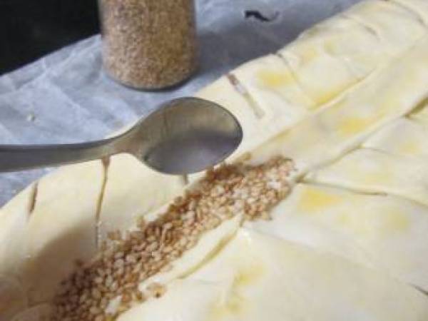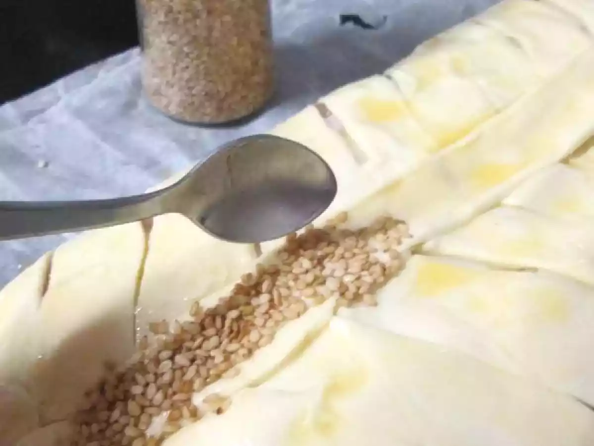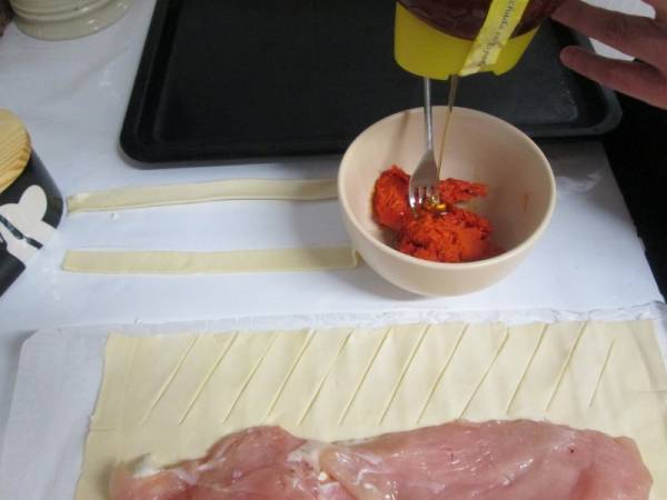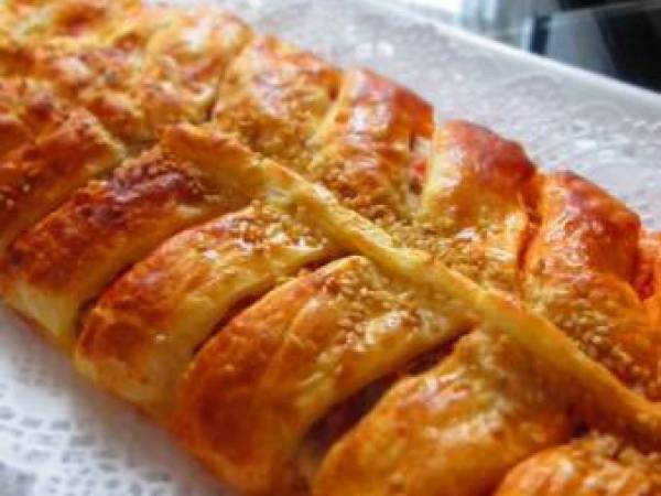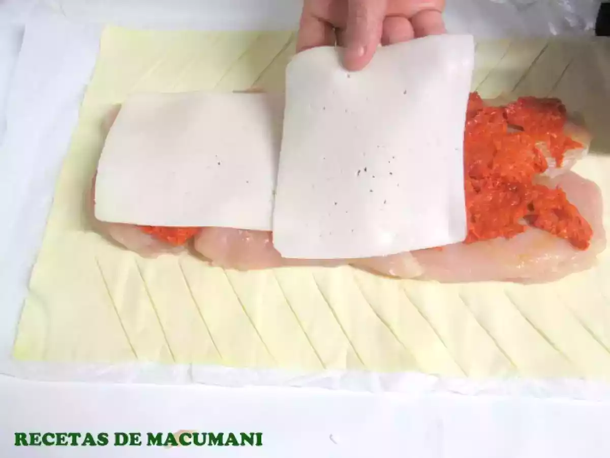 Trenza de pollo y sobrasada AnteriorSiguiente EntranteFácil50 min691 Kcal Enviar esta receta a un amigo Imprimir esta página Preguntar al autor Publicar la foto de esta receta Hojaldre relleno de presentacion vistosa, fácil y rápido Ingredientes 4 1 masa de hojaldre 2 pechugas de pollo sobrasada miel queso de cabra en lonchas huevo semillas de sésamo Costo estimado: 6.01Euros€ (1.5€/porción)