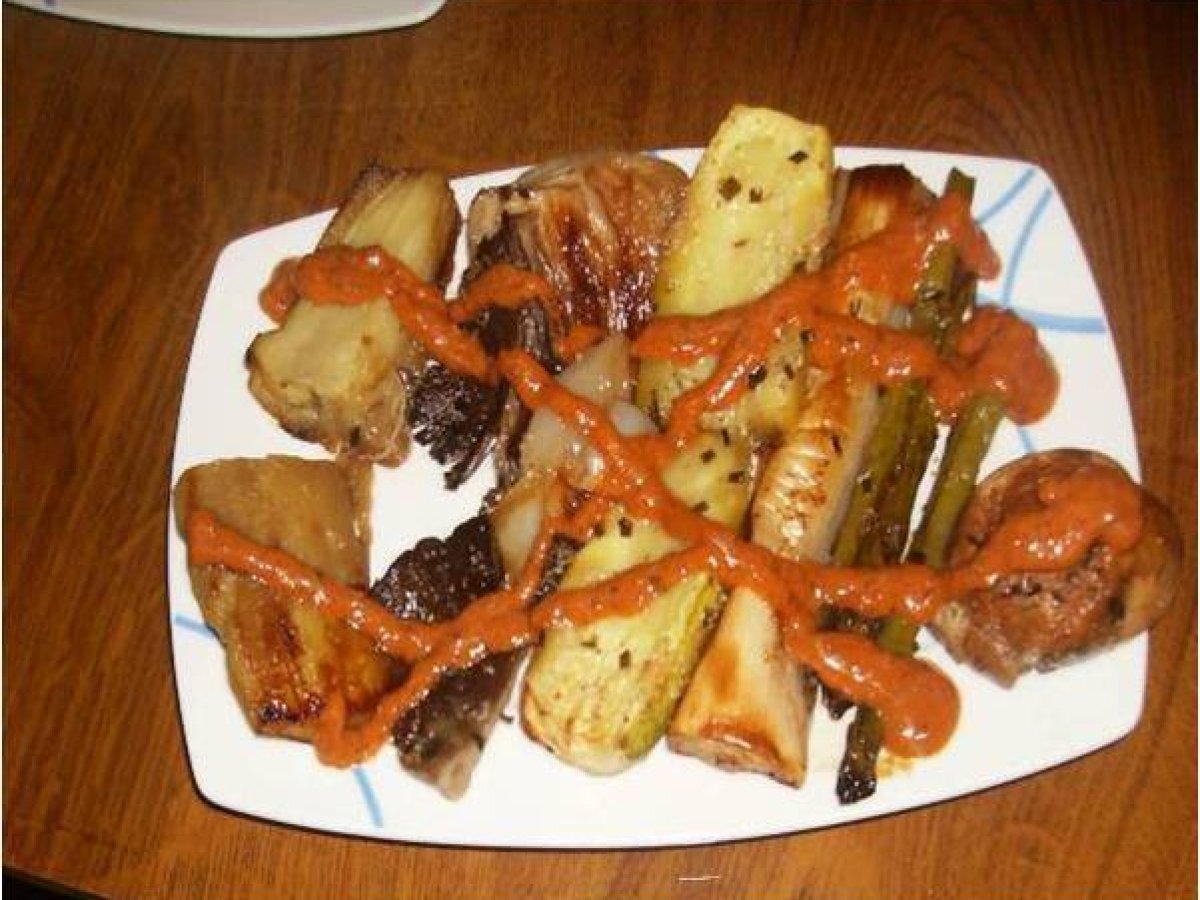 Verduras con salsa romesco AnteriorSiguiente EntranteMedio25 min Enviar esta receta a un amigo Imprimir esta página Preguntar al autor Publicar la foto de esta receta Una forma de tomar verduras, ricas y sanas Ingredientes 2 Puerros Calabacin Berenjenas Setas Espárragos Cebolletas Aceite. Ajos , cebolla, cebollino, liofilizado y pimienta de colores y sal