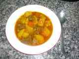 Ingredientes: 600 g de carne de cerdo para estofado 2 zanahorias media cebolleta medio puerro medio pimiento rojo judias verdes champiñones vasito de vino...