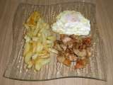 Patatas fritas en ajo cabañil con cordero y huevo frito Plato Fácil 5 min 20 minIngredientes: Ingredientes para 2 personas: 2 patatas 1 ajo grande o 2 pequeños Un buen chorro de vinagre 2 filetes de cordero 2 huevos