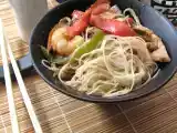 Ingredientes: 400 g de lomo de cerdo 1 paquete de fideos chinos de arroz 1 Pimiento verde pequeño 1 Pimiento rojo pequeño 1 zanahoria grande 200 g de...