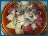 Ingredientes: 2 dientes de ajo 2 o 3 patatas grandecitas 300 g de champiñones 1/2 vaso de vino blanco 150 g de chorizo de sarta dulce o picante Caldo de...