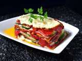 Ingredientes: placas de lasaña, rodajas de berenjenas, tiras de pimiento rojo, tiras de pimiento verde, rodajas de tomate, queso de cabra en rulo, pesto...