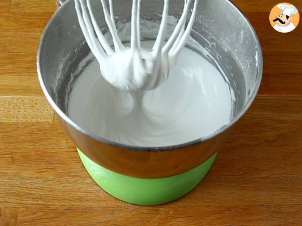 Montar las claras a punto de nieve y añadir el azúcar poco a poco. Batir hasta que salgan picos y la mezcla adquiera una textura compacta y un color brillante.