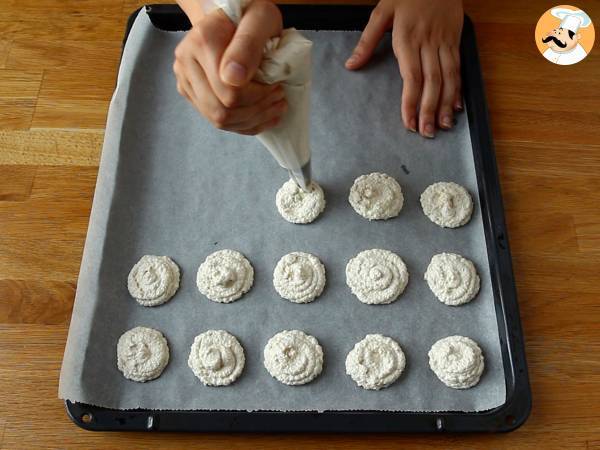 Preparar una bandeja de horno con un papel sulfurizado. Meter las claras montadas en una manga pastelera, cortar la punta de la manga y formar pequeñas bolas (del tamaño de una nuez más o menos) sobre el papel sulfurizado. Si no dispones de una manga pastelera puedes usar una bolsa de congelación o incluso formar los amaretti con la ayuda de dos cucharitas. Al hornear crecen un poco así que no hagas las bolas muy grandes.