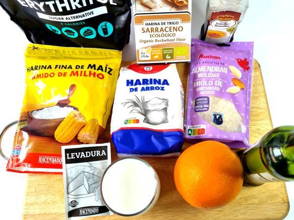 Este es mi primer bizcocho sin gluten, apto para celíacos y veganos. He utilizado la mezcla de harinas sin gluten indicada por Gloria del blog vegano "La Gloria vegana". A mi me ha gustado aunque noto que se desmiga un poco al no tener la elasticidad que le proporciona el gluten. Tenía ganas de hacer un bizcocho utilizando una naranja entera triturada pero me daba miedo que lo blanco de la naranja amargara pero la verdad es que no ha sido así.